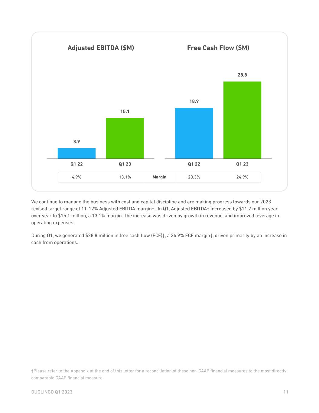 DUOLINGO Q1 2023 11 We continue to manage the business with cost and capital discipline and are making progress towards our 2023 revised target range of 11-12% Adjusted EBITDA margin†.  In Q1, Adjusted EBITDA† increased by $11.2 million year over year to $15.1 million, a 13.1% margin. The increase was driven by growth in revenue, and improved leverage in operating expenses.  During Q1, we generated $28.8 million in free cash flow (FCF)†, a 24.9% FCF margin†, driven primarily by an increase in cash from operations. †Please refer to the Appendix at the end of this letter for a reconciliation of these non-GAAP financial measures to the most directly comparable GAAP financial measure.