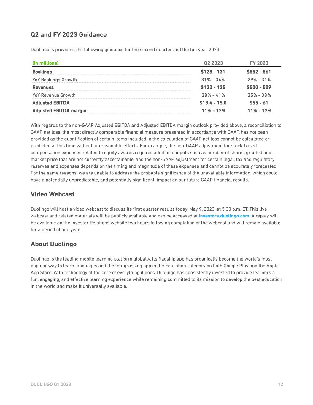 DUOLINGO Q1 2023 12 Q2 and FY 2023 Guidance Duolingo is providing the following guidance for the second quarter and the full year 2023. With regards to the non-GAAP Adjusted EBITDA and Adjusted EBITDA margin outlook provided above, a reconciliation to GAAP net loss, the most directly comparable financial measure presented in accordance with GAAP, has not been provided as the quantification of certain items included in the calculation of GAAP net loss cannot be calculated or predicted at this time without unreasonable efforts. For example, the non-GAAP adjustment for stock-based compensation expenses related to equity awards requires additional inputs such as number of shares granted and market price that are not currently ascertainable, and the non-GAAP adjustment for certain legal, tax and regulatory reserves and expenses depends on the timing and magnitude of these expenses and cannot be accurately forecasted. For the same reasons, we are unable to address the probable significance of the unavailable information, which could have a potentially unpredictable, and potentially significant, impact on our future GAAP financial results. Video Webcast Duolingo will host a video webcast to discuss its first quarter results today, May 9, 2023, at 5:30 p.m. ET. This live webcast and related materials will be publicly available and can be accessed at . A replay will be available on the Investor Relations website two hours following completion of the webcast and will remain available for a period of one year. investors.duolingo.com About Duolingo Duolingo is the leading mobile learning platform globally. Its flagship app has organically become the world's most popular way to learn languages and the top-grossing app in the Education category on both Google Play and the Apple App Store. With technology at the core of everything it does, Duolingo has consistently invested to provide learners a fun, engaging, and effective learning experience while remaining committed to its mission to develop the best education in the world and make it universally available.
