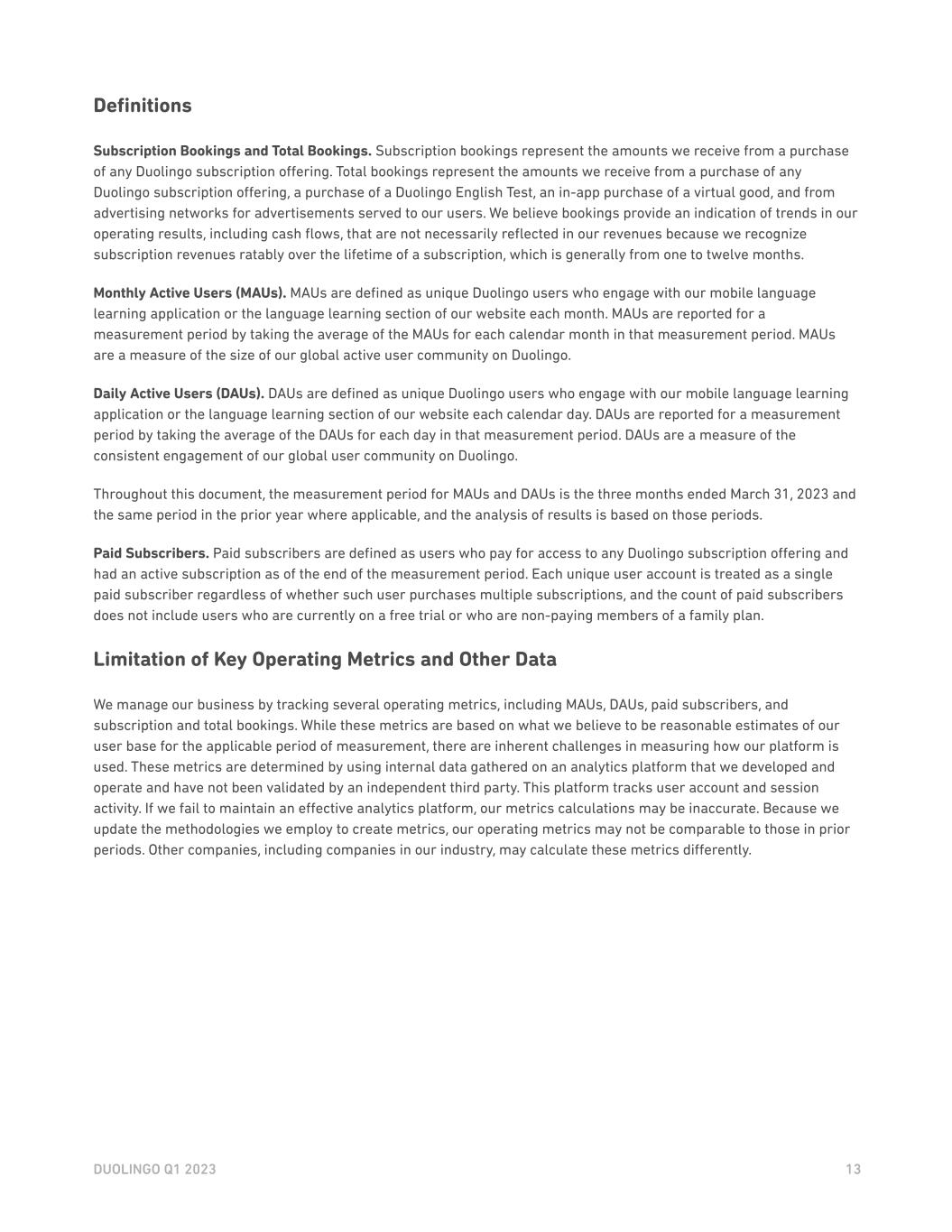 DUOLINGO Q1 2023 13 Definitions Subscription Bookings and Total Bookings. Subscription bookings represent the amounts we receive from a purchase of any Duolingo subscription offering. Total bookings represent the amounts we receive from a purchase of any Duolingo subscription offering, a purchase of a Duolingo English Test, an in-app purchase of a virtual good, and from advertising networks for advertisements served to our users. We believe bookings provide an indication of trends in our operating results, including cash flows, that are not necessarily reflected in our revenues because we recognize subscription revenues ratably over the lifetime of a subscription, which is generally from one to twelve months. Monthly Active Users (MAUs). MAUs are defined as unique Duolingo users who engage with our mobile language learning application or the language learning section of our website each month. MAUs are reported for a measurement period by taking the average of the MAUs for each calendar month in that measurement period. MAUs are a measure of the size of our global active user community on Duolingo.  Daily Active Users (DAUs). DAUs are defined as unique Duolingo users who engage with our mobile language learning application or the language learning section of our website each calendar day. DAUs are reported for a measurement period by taking the average of the DAUs for each day in that measurement period. DAUs are a measure of the consistent engagement of our global user community on Duolingo.  Throughout this document, the measurement period for MAUs and DAUs is the three months ended March 31, 2023 and the same period in the prior year where applicable, and the analysis of results is based on those periods.  Paid Subscribers. Paid subscribers are defined as users who pay for access to any Duolingo subscription offering and had an active subscription as of the end of the measurement period. Each unique user account is treated as a single paid subscriber regardless of whether such user purchases multiple subscriptions, and the count of paid subscribers does not include users who are currently on a free trial or who are non-paying members of a family plan. Limitation of Key Operating Metrics and Other Data We manage our business by tracking several operating metrics, including MAUs, DAUs, paid subscribers, and subscription and total bookings. While these metrics are based on what we believe to be reasonable estimates of our user base for the applicable period of measurement, there are inherent challenges in measuring how our platform is used. These metrics are determined by using internal data gathered on an analytics platform that we developed and operate and have not been validated by an independent third party. This platform tracks user account and session activity. If we fail to maintain an effective analytics platform, our metrics calculations may be inaccurate. Because we update the methodologies we employ to create metrics, our operating metrics may not be comparable to those in prior periods. Other companies, including companies in our industry, may calculate these metrics differently.