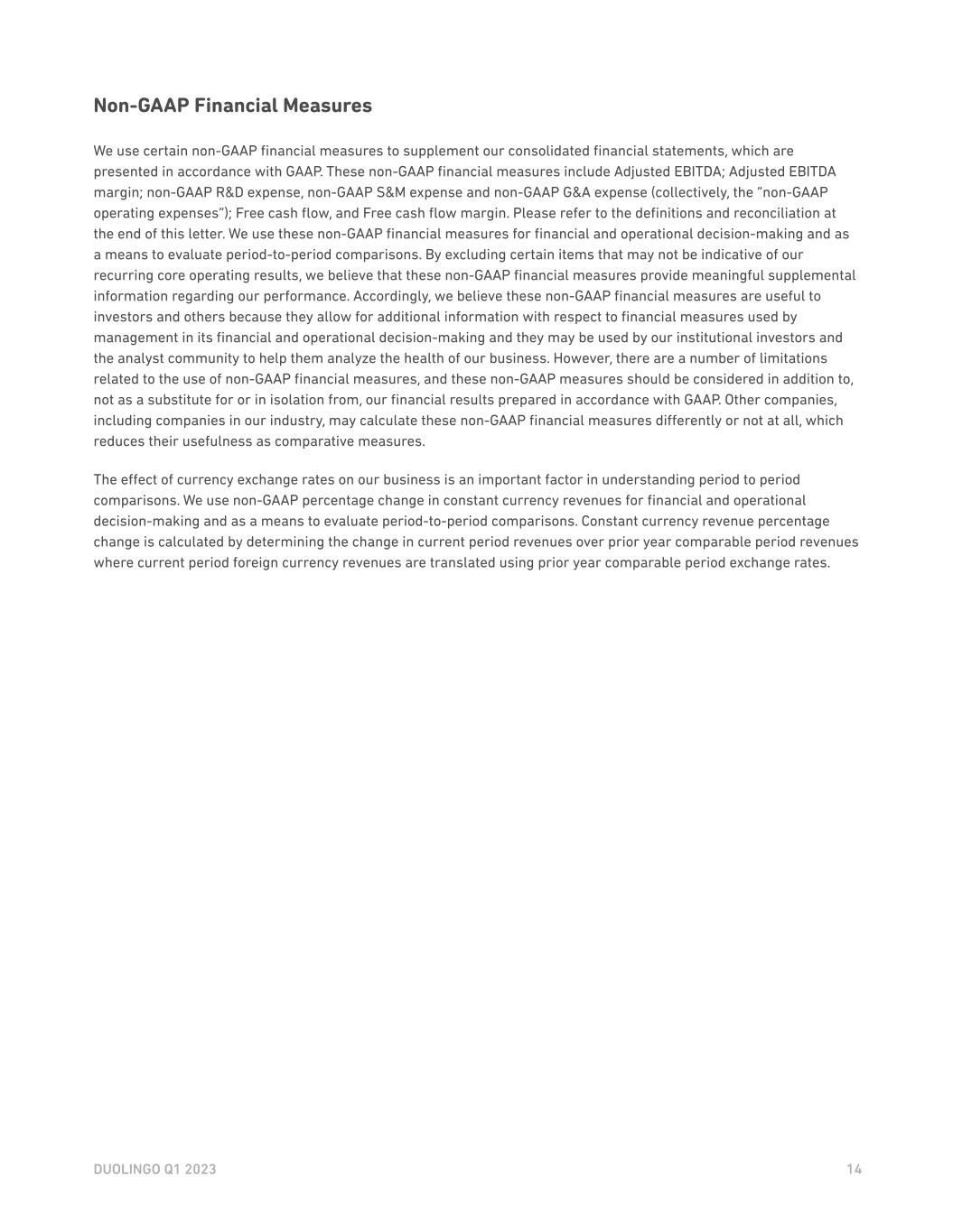DUOLINGO Q1 2023 14 Non-GAAP Financial Measures We use certain non-GAAP financial measures to supplement our consolidated financial statements, which are presented in accordance with GAAP. These non-GAAP financial measures include Adjusted EBITDA; Adjusted EBITDA margin; non-GAAP R&D expense, non-GAAP S&M expense and non-GAAP G&A expense (collectively, the “non-GAAP operating expenses”); Free cash flow, and Free cash flow margin. Please refer to the definitions and reconciliation at the end of this letter. We use these non-GAAP financial measures for financial and operational decision-making and as a means to evaluate period-to-period comparisons. By excluding certain items that may not be indicative of our recurring core operating results, we believe that these non-GAAP financial measures provide meaningful supplemental information regarding our performance. Accordingly, we believe these non-GAAP financial measures are useful to investors and others because they allow for additional information with respect to financial measures used by management in its financial and operational decision-making and they may be used by our institutional investors and the analyst community to help them analyze the health of our business. However, there are a number of limitations related to the use of non-GAAP financial measures, and these non-GAAP measures should be considered in addition to, not as a substitute for or in isolation from, our financial results prepared in accordance with GAAP. Other companies, including companies in our industry, may calculate these non-GAAP financial measures differently or not at all, which reduces their usefulness as comparative measures. The effect of currency exchange rates on our business is an important factor in understanding period to period comparisons. We use non-GAAP percentage change in constant currency revenues for financial and operational decision-making and as a means to evaluate period-to-period comparisons. Constant currency revenue percentage change is calculated by determining the change in current period revenues over prior year comparable period revenues where current period foreign currency revenues are translated using prior year comparable period exchange rates.