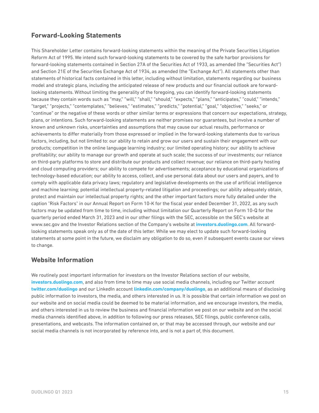 DUOLINGO Q1 2023 15 Forward-Looking Statements This Shareholder Letter contains forward-looking statements within the meaning of the Private Securities Litigation Reform Act of 1995. We intend such forward-looking statements to be covered by the safe harbor provisions for forward-looking statements contained in Section 27A of the Securities Act of 1933, as amended (the “Securities Act”) and Section 21E of the Securities Exchange Act of 1934, as amended (the “Exchange Act”). All statements other than statements of historical facts contained in this letter, including without limitation, statements regarding our business model and strategic plans, including the anticipated release of new products and our financial outlook are forward- looking statements. Without limiting the generality of the foregoing, you can identify forward-looking statements because they contain words such as “may,” “will,” “shall,” “should,” “expects,” “plans,” “anticipates,” “could,” “intends,” “target,” “projects,” “contemplates,” “believes,” “estimates,” “predicts,” “potential,” “goal,” “objective,” “seeks,” or “continue” or the negative of these words or other similar terms or expressions that concern our expectations, strategy, plans, or intentions. Such forward-looking statements are neither promises nor guarantees, but involve a number of known and unknown risks, uncertainties and assumptions that may cause our actual results, performance or achievements to differ materially from those expressed or implied in the forward-looking statements due to various factors, including, but not limited to: our ability to retain and grow our users and sustain their engagement with our products; competition in the online language learning industry; our limited operating history; our ability to achieve profitability; our ability to manage our growth and operate at such scale; the success of our investments; our reliance on third-party platforms to store and distribute our products and collect revenue; our reliance on third-party hosting and cloud computing providers; our ability to compete for advertisements; acceptance by educational organizations of technology-based education; our ability to access, collect, and use personal data about our users and payers, and to comply with applicable data privacy laws; regulatory and legislative developments on the use of artificial intelligence and machine learning; potential intellectual property-related litigation and proceedings; our ability adequately obtain, protect and maintain our intellectual property rights; and the other important factors more fully detailed under the caption "Risk Factors" in our Annual Report on Form 10-K for the fiscal year ended December 31, 2022, as any such factors may be updated from time to time, including without limitation our Quarterly Report on Form 10-Q for the quarterly period ended March 31, 2023 and in our other filings with the SEC, accessible on the SEC’s website at www.sec.gov and the Investor Relations section of the Company’s website at . All forward- looking statements speak only as of the date of this letter. While we may elect to update such forward-looking statements at some point in the future, we disclaim any obligation to do so, even if subsequent events cause our views to change. investors.duolingo.com Website Information We routinely post important information for investors on the Investor Relations section of our website, , and also from time to time may use social media channels, including our Twitter account  and our LinkedIn account , as an additional means of disclosing public information to investors, the media, and others interested in us. It is possible that certain information we post on our website and on social media could be deemed to be material information, and we encourage investors, the media, and others interested in us to review the business and financial information we post on our website and on the social media channels identified above, in addition to following our press releases, SEC filings, public conference calls, presentations, and webcasts. The information contained on, or that may be accessed through, our website and our social media channels is not incorporated by reference into, and is not a part of, this document. investors.duolingo.com twitter.com/duolingo linkedin.com/company/duolingo