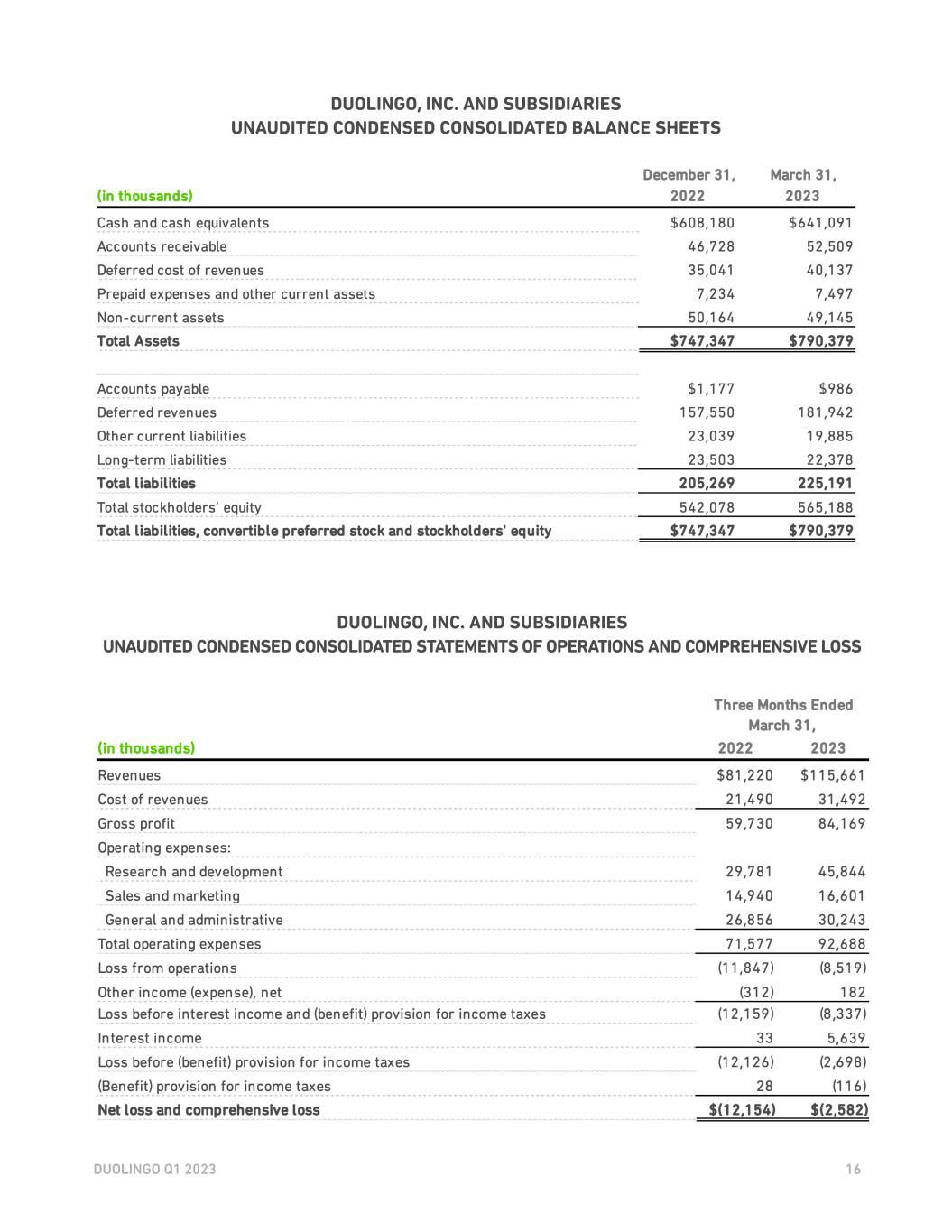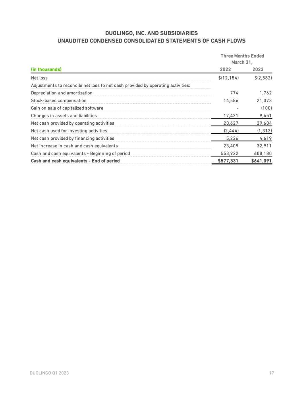 DUOLINGO Q1 2023 16 DUOLINGO, INC. AND SUBSIDIARIES UNAUDITED CONDENSED CONSOLIDATED BALANCE SHEETS DUOLINGO, INC. AND SUBSIDIARIES UNAUDITED CONDENSED CONSOLIDATED STATEMENTS OF OPERATIONS AND COMPREHENSIVE LOSS