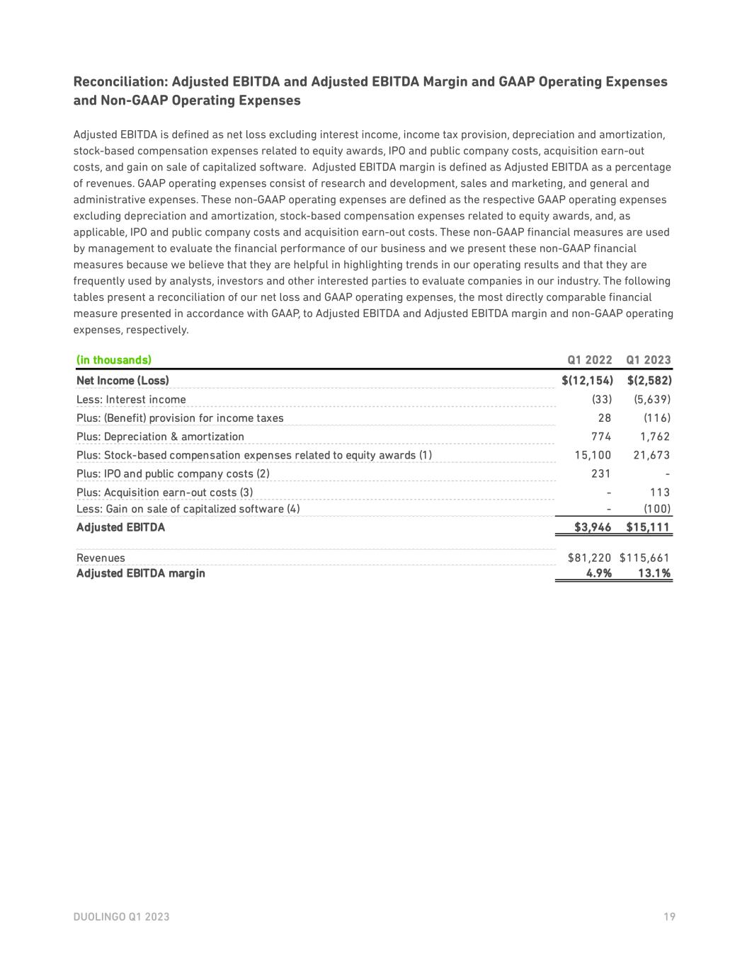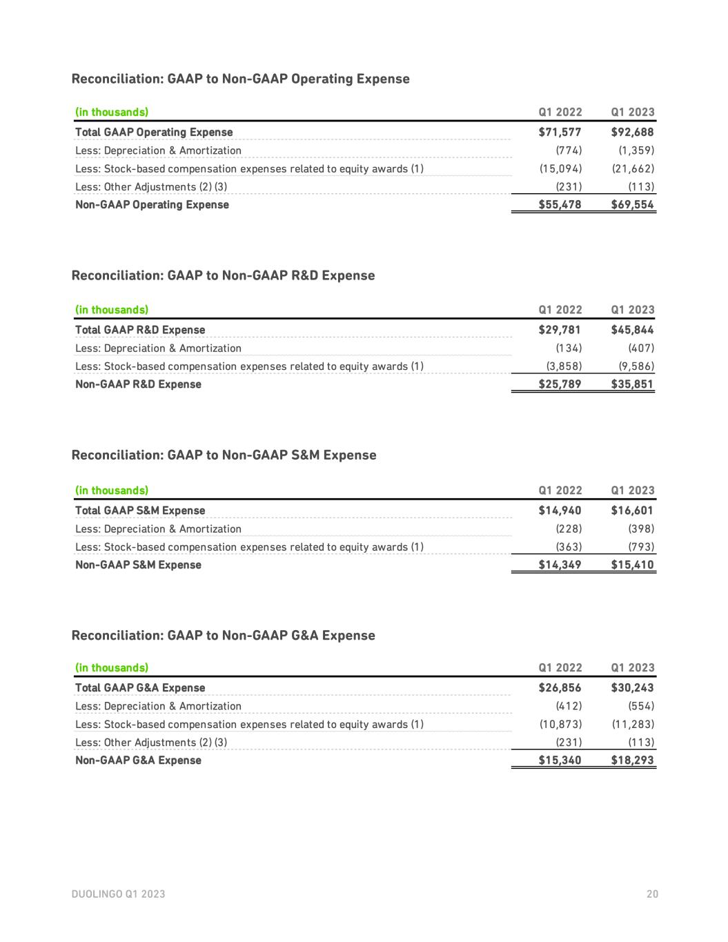DUOLINGO Q1 2023 19 Reconciliation: Adjusted EBITDA and Adjusted EBITDA Margin and GAAP Operating Expenses and Non-GAAP Operating Expenses Adjusted EBITDA is defined as net loss excluding interest income, income tax provision, depreciation and amortization, stock-based compensation expenses related to equity awards, IPO and public company costs, acquisition earn-out costs, and gain on sale of capitalized software.  Adjusted EBITDA margin is defined as Adjusted EBITDA as a percentage of revenues. GAAP operating expenses consist of research and development, sales and marketing, and general and administrative expenses. These non-GAAP operating expenses are defined as the respective GAAP operating expenses excluding depreciation and amortization, stock-based compensation expenses related to equity awards, and, as applicable, IPO and public company costs and acquisition earn-out costs. These non-GAAP financial measures are used by management to evaluate the financial performance of our business and we present these non-GAAP financial measures because we believe that they are helpful in highlighting trends in our operating results and that they are frequently used by analysts, investors and other interested parties to evaluate companies in our industry. The following tables present a reconciliation of our net loss and GAAP operating expenses, the most directly comparable financial measure presented in accordance with GAAP, to Adjusted EBITDA and Adjusted EBITDA margin and non-GAAP operating expenses, respectively.