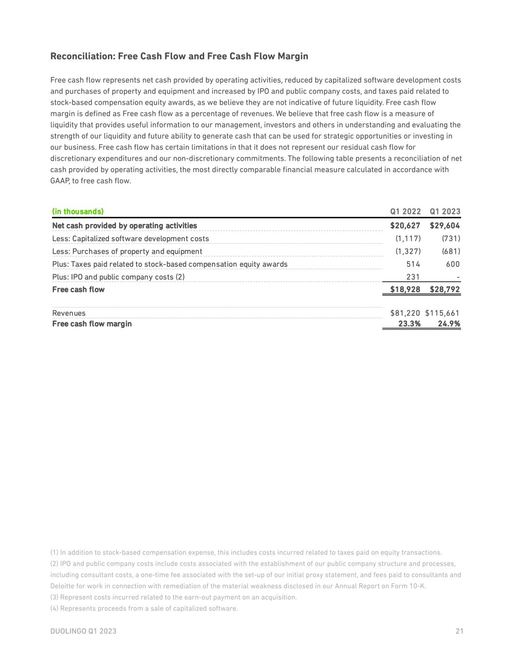 DUOLINGO Q1 2023 21 Reconciliation: Free Cash Flow and Free Cash Flow Margin Free cash flow represents net cash provided by operating activities, reduced by capitalized software development costs and purchases of property and equipment and increased by IPO and public company costs, and taxes paid related to stock-based compensation equity awards, as we believe they are not indicative of future liquidity. Free cash flow margin is defined as Free cash flow as a percentage of revenues. We believe that free cash flow is a measure of liquidity that provides useful information to our management, investors and others in understanding and evaluating the strength of our liquidity and future ability to generate cash that can be used for strategic opportunities or investing in our business. Free cash flow has certain limitations in that it does not represent our residual cash flow for discretionary expenditures and our non-discretionary commitments. The following table presents a reconciliation of net cash provided by operating activities, the most directly comparable financial measure calculated in accordance with GAAP, to free cash flow. (1) In addition to stock-based compensation expense, this includes costs incurred related to taxes paid on equity transactions.  (2) IPO and public company costs include costs associated with the establishment of our public company structure and processes, including consultant costs, a one-time fee associated with the set-up of our initial proxy statement, and fees paid to consultants and Deloitte for work in connection with remediation of the material weakness disclosed in our Annual Report on Form 10-K. (3) Represent costs incurred related to the earn-out payment on an acquisition. (4) Represents proceeds from a sale of capitalized software.