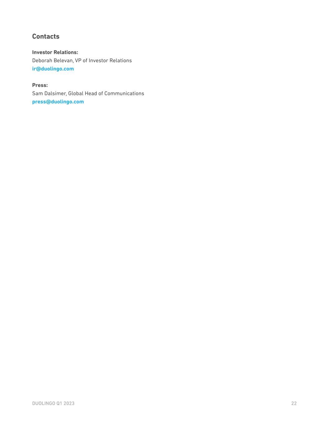 DUOLINGO Q1 2023 22 Investor Relations: Deborah Belevan, VP of Investor Relations Press: Sam Dalsimer, Global Head of Communications ir@duolingo.com press@duolingo.com Contacts
