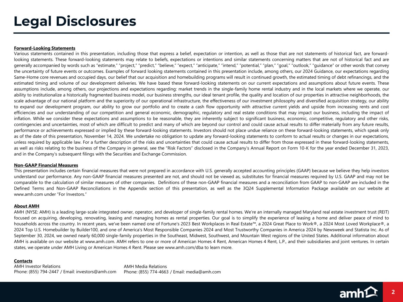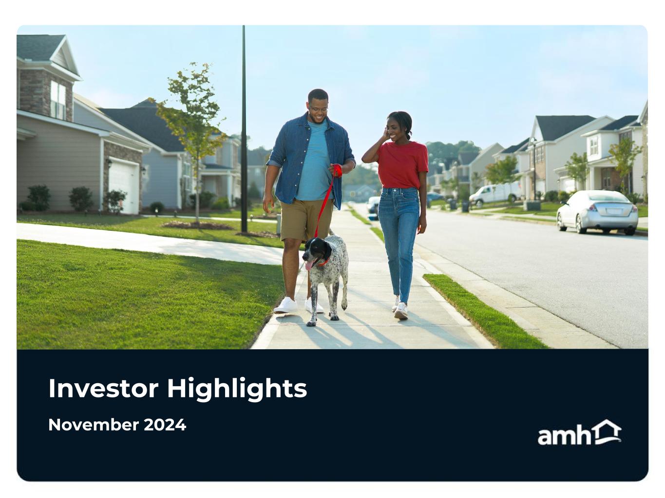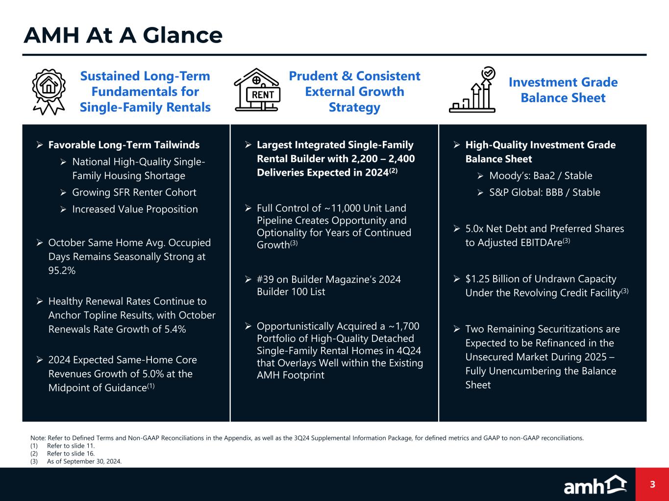 2 Forward-Looking Statements Various statements contained in this presentation, including those that express a belief, expectation or intention, as well as those that are not statements of historical fact, are forward- looking statements. These forward-looking statements may relate to beliefs, expectations or intentions and similar statements concerning matters that are not of historical fact and are generally accompanied by words such as “estimate,” “project,” “predict,” “believe,” “expect,” “anticipate,” “intend,” “potential,” “plan,” “goal,” “outlook,” “guidance” or other words that convey the uncertainty of future events or outcomes. Examples of forward looking statements contained in this presentation include, among others, our 2024 Guidance, our expectations regarding Same-Home core revenues and occupied days, our belief that our acquisition and homebuilding programs will result in continued growth, the estimated timing of debt refinancings, and the estimated timing and volume of our development deliveries. We have based these forward-looking statements on our current expectations and assumptions about future events. These assumptions include, among others, our projections and expectations regarding: market trends in the single-family home rental industry and in the local markets where we operate, our ability to institutionalize a historically fragmented business model, our business strengths, our ideal tenant profile, the quality and location of our properties in attractive neighborhoods, the scale advantage of our national platform and the superiority of our operational infrastructure, the effectiveness of our investment philosophy and diversified acquisition strategy, our ability to expand our development program, our ability to grow our portfolio and to create a cash flow opportunity with attractive current yields and upside from increasing rents and cost efficiencies and our understanding of our competition and general economic, demographic, regulatory and real estate conditions that may impact our business, including the impact of inflation. While we consider these expectations and assumptions to be reasonable, they are inherently subject to significant business, economic, competitive, regulatory and other risks, contingencies and uncertainties, most of which are difficult to predict and many of which are beyond our control and could cause actual results to differ materially from any future results, performance or achievements expressed or implied by these forward-looking statements. Investors should not place undue reliance on these forward-looking statements, which speak only as of the date of this presentation, November 14, 2024. We undertake no obligation to update any forward-looking statements to conform to actual results or changes in our expectations, unless required by applicable law. For a further description of the risks and uncertainties that could cause actual results to differ from those expressed in these forward-looking statements, as well as risks relating to the business of the Company in general, see the “Risk Factors” disclosed in the Company’s Annual Report on Form 10-K for the year ended December 31, 2023, and in the Company’s subsequent filings with the Securities and Exchange Commission. Non-GAAP Financial Measures This presentation includes certain financial measures that were not prepared in accordance with U.S. generally accepted accounting principles (GAAP) because we believe they help investors understand our performance. Any non-GAAP financial measures presented are not, and should not be viewed as, substitutes for financial measures required by U.S. GAAP and may not be comparable to the calculation of similar measures of other companies. Definitions of these non-GAAP financial measures and a reconciliation from GAAP to non-GAAP are included in the Defined Terms and Non-GAAP Reconciliations in the Appendix section of this presentation, as well as the 3Q24 Supplemental Information Package available on our website at www.amh.com under “For Investors.” About AMH AMH (NYSE: AMH) is a leading large-scale integrated owner, operator, and developer of single-family rental homes. We're an internally managed Maryland real estate investment trust (REIT) focused on acquiring, developing, renovating, leasing and managing homes as rental properties. Our goal is to simplify the experience of leasing a home and deliver peace of mind to households across the country. In recent years, we've been named one of Fortune's 2023 Best Workplaces in Real Estate , a 2024 Great Place to Work®, a 2024 Most Loved Workplace®, a 2024 Top U.S. Homebuilder by Builder100, and one of America's Most Responsible Companies 2024 and Most Trustworthy Companies in America 2024 by Newsweek and Statista Inc. As of September 30, 2024, we owned nearly 60,000 single-family properties in the Southeast, Midwest, Southwest, and Mountain West regions of the United States. Additional information about AMH is available on our website at www.amh.com. AMH refers to one or more of American Homes 4 Rent, American Homes 4 Rent, L.P., and their subsidiaries and joint ventures. In certain states, we operate under AMH Living or American Homes 4 Rent. Please see www.amh.com/dba to learn more. Contacts AMH Investor Relations Phone: (855) 794-2447 / Email: investors@amh.com AMH Media Relations Phone: (855) 774-4663 / Email: media@amh.com Legal Disclosures