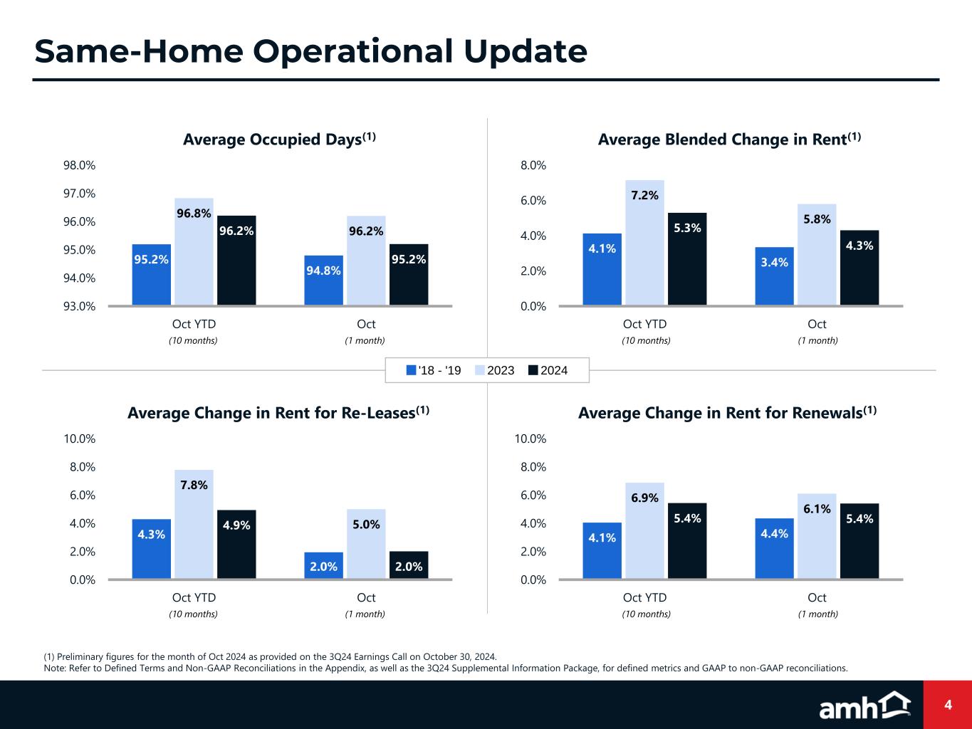 AMH At A Glance 3 ➢ Largest Integrated Single-Family Rental Builder with 2,200 – 2,400 Deliveries Expected in 2024(2) ➢ Full Control of ~11,000 Unit Land Pipeline Creates Opportunity and Optionality for Years of Continued Growth(3) ➢ #39 on Builder Magazine’s 2024 Builder 100 List ➢ Opportunistically Acquired a ~1,700 Portfolio of High-Quality Detached Single-Family Rental Homes in 4Q24 that Overlays Well within the Existing AMH Footprint ➢ Favorable Long-Term Tailwinds ➢ National High-Quality Single- Family Housing Shortage ➢ Growing SFR Renter Cohort ➢ Increased Value Proposition ➢ October Same Home Avg. Occupied Days Remains Seasonally Strong at 95.2% ➢ Healthy Renewal Rates Continue to Anchor Topline Results, with October Renewals Rate Growth of 5.4% ➢ 2024 Expected Same-Home Core Revenues Growth of 5.0% at the Midpoint of Guidance(1) ➢ High-Quality Investment Grade Balance Sheet ➢ Moody’s: Baa2 / Stable ➢ S&P Global: BBB / Stable ➢ 5.0x Net Debt and Preferred Shares to Adjusted EBITDAre(3) ➢ $1.25 Billion of Undrawn Capacity Under the Revolving Credit Facility(3) ➢ Two Remaining Securitizations are Expected to be Refinanced in the Unsecured Market During 2025 – Fully Unencumbering the Balance Sheet Sustained Long-Term Fundamentals for Single-Family Rentals Investment Grade Balance Sheet Prudent & Consistent External Growth Strategy Note: Refer to Defined Terms and Non-GAAP Reconciliations in the Appendix, as well as the 3Q24 Supplemental Information Package, for defined metrics and GAAP to non-GAAP reconciliations. (1) Refer to slide 11. (2) Refer to slide 16. (3) As of September 30, 2024.