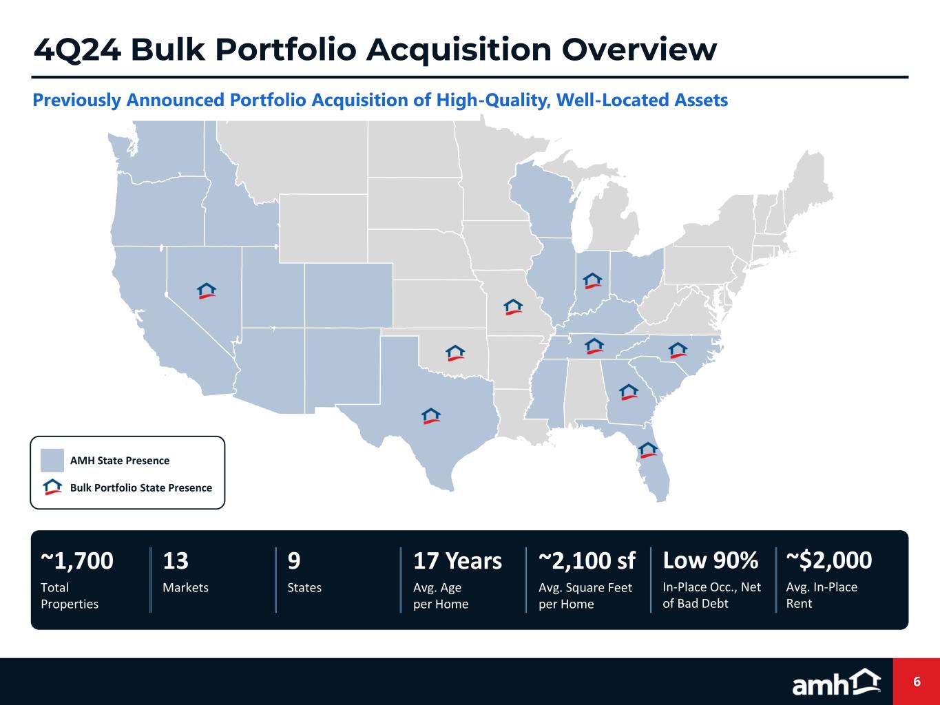 4Q24 Bulk Portfolio Acquisition Overview Previously Announced Portfolio Acquisition of High-Quality, Well-Located Assets 13 Markets Low 90% In-Place Occ., Net of Bad Debt 17 Years Avg. Age per Home 9 States ~1,700 Total Properties ~$2,000 Avg. In-Place Rent ~2,100 sf Avg. Square Feet per Home AMH State Presence Bulk Portfolio State Presence 6