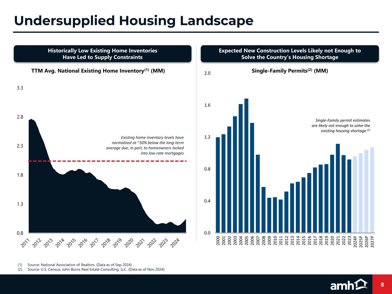 0.0 0.4 0.8 1.2 1.6 2.0 2 0 0 0 2 0 0 1 2 0 0 2 2 0 0 3 2 0 0 4 2 0 0 5 2 0 0 6 2 0 0 7 2 0 0 8 2 0 0 9 2 0 1 0 2 0 1 1 2 0 1 2 2 0 1 3 2 0 1 4 2 0 1 5 2 0 1 6 2 0 1 7 2 0 1 8 2 0 1 9 2 0 2 0 2 0 2 1 2 0 2 2 2 0 2 3 2 0 2 4 P 2 0 2 5 P 2 0 2 6 P 2 0 2 7 P Single-Family Permits(2) (MM) 0.8 1.3 1.8 2.3 2.8 3.3 TTM Avg. National Existing Home Inventory(1) (MM) 8 Undersupplied Housing Landscape (1) Source: National Association of Realtors. (Data as of Sep 2024) (2) Source: U.S. Census; John Burns Real Estate Consulting, LLC. (Data as of Nov 2024) Single-Family permit estimates are likely not enough to solve the existing housing shortage (2) Historically Low Existing Home Inventories Have Led to Supply Constraints Expected New Construction Levels Likely not Enough to Solve the Country’s Housing Shortage Existing home inventory levels have normalized at ~50% below the long-term average due, in part, to homeowners locked into low-rate mortgages