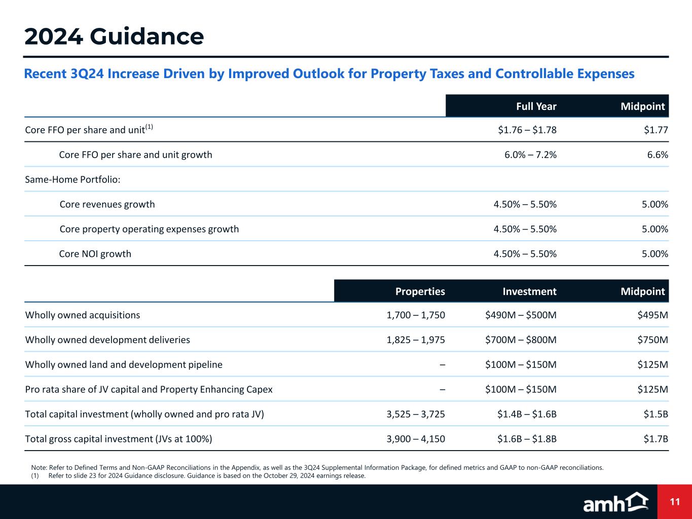 11 2024 Guidance Note: Refer to Defined Terms and Non-GAAP Reconciliations in the Appendix, as well as the 3Q24 Supplemental Information Package, for defined metrics and GAAP to non-GAAP reconciliations. (1) Refer to slide 23 for 2024 Guidance disclosure. Guidance is based on the October 29, 2024 earnings release. Full Year Midpoint. Core FFO per share and unit(1) $1.76 – $1.78 $1.77 Core FFO per share and unit growth 6.0% – 7.2% 6.6% Same-Home Portfolio: Core revenues growth 4.50% – 5.50% 5.00% Core property operating expenses growth 4.50% – 5.50% 5.00% Core NOI growth 4.50% – 5.50% 5.00% Properties Investment Midpoint. Wholly owned acquisitions 1,700 – 1,750 $490M – $500M $495M Wholly owned development deliveries 1,825 – 1,975 $700M – $800M $750M Wholly owned land and development pipeline – $100M – $150M $125M Pro rata share of JV capital and Property Enhancing Capex – $100M – $150M $125M Total capital investment (wholly owned and pro rata JV) 3,525 – 3,725 $1.4B – $1.6B $1.5B Total gross capital investment (JVs at 100%) 3,900 – 4,150 $1.6B – $1.8B $1.7B Recent 3Q24 Increase Driven by Improved Outlook for Property Taxes and Controllable Expenses