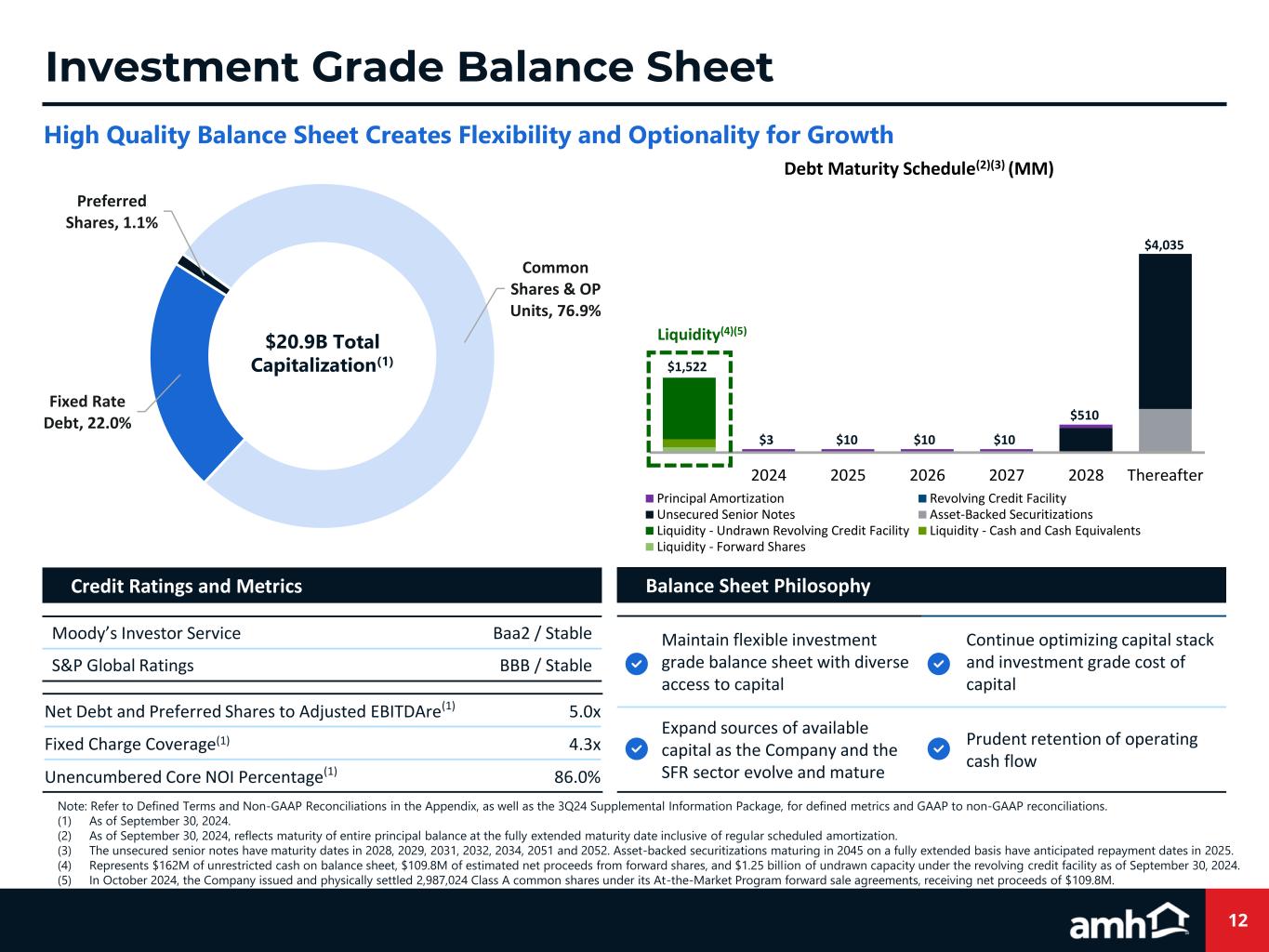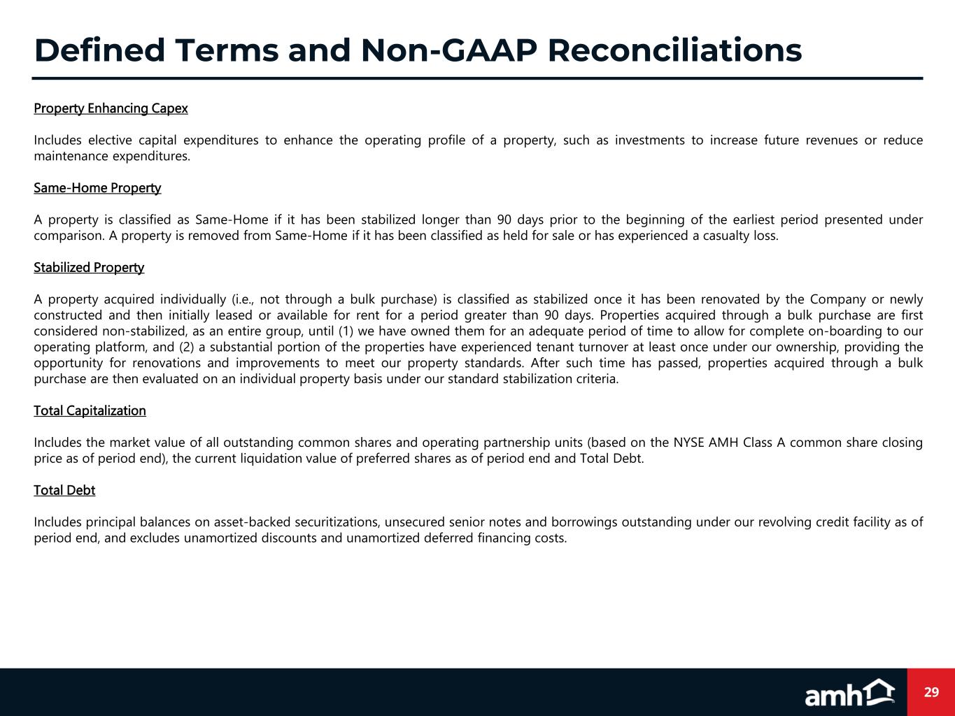 29 Property Enhancing Capex Includes elective capital expenditures to enhance the operating profile of a property, such as investments to increase future revenues or reduce maintenance expenditures. Same-Home Property A property is classified as Same-Home if it has been stabilized longer than 90 days prior to the beginning of the earliest period presented under comparison. A property is removed from Same-Home if it has been classified as held for sale or has experienced a casualty loss. Stabilized Property A property acquired individually (i.e., not through a bulk purchase) is classified as stabilized once it has been renovated by the Company or newly constructed and then initially leased or available for rent for a period greater than 90 days. Properties acquired through a bulk purchase are first considered non-stabilized, as an entire group, until (1) we have owned them for an adequate period of time to allow for complete on-boarding to our operating platform, and (2) a substantial portion of the properties have experienced tenant turnover at least once under our ownership, providing the opportunity for renovations and improvements to meet our property standards. After such time has passed, properties acquired through a bulk purchase are then evaluated on an individual property basis under our standard stabilization criteria. Total Capitalization Includes the market value of all outstanding common shares and operating partnership units (based on the NYSE AMH Class A common share closing price as of period end), the current liquidation value of preferred shares as of period end and Total Debt. Total Debt Includes principal balances on asset-backed securitizations, unsecured senior notes and borrowings outstanding under our revolving credit facility as of period end, and excludes unamortized discounts and unamortized deferred financing costs. Defined Terms and Non-GAAP Reconciliations