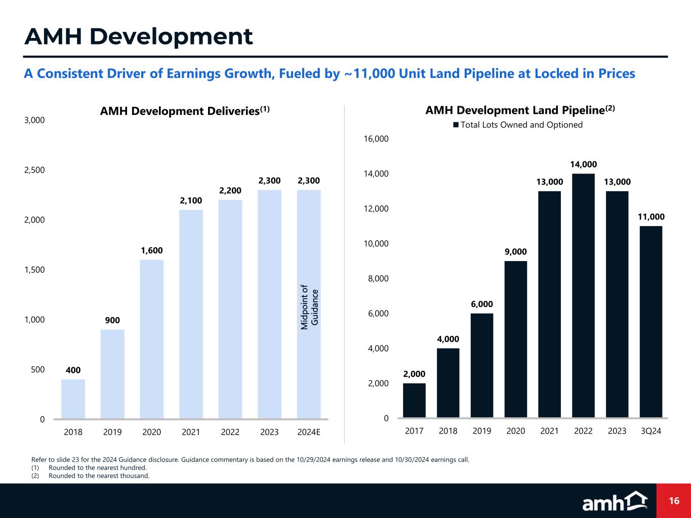 15 Strategy Design and create ideal rental Homes and Communities using data and insights from AMH’s integrated development and operating platforms Less opportunity for alignment of interests between developer and operators Product Type & Location High-quality, detached, single family homes, with attached garages in highly desirable neighborhoods Horizontal apartments, townhomes or detached homes, commonly in tertiary neighborhoods Home Quality Stylish, upgraded fixtures and finishes: granite, hard surface flooring, stainless steel appliances Often “builder basic” or lower quality fixtures and finishes Expense Efficiency Consistent, repeatable floorplans, fixtures and finishes selected for long-term operating expenditure efficiency Varied floorplans, finishes and fixtures, typically selected for lowest up-front cost Value Creation AMH homes are constructed at significant discount to market value, resulting in immediate value creation Commonly purchased at or near market value     AMH Amenity Centers create a community feel for residents AMH Development Homes average 2,000 sq. ft. and come with private yards and fences Other BTR Product AMH Development: Not All BTR is the Same Building the Ideal Rental Home Through the Lens of our Best-In-Class Operating Platform