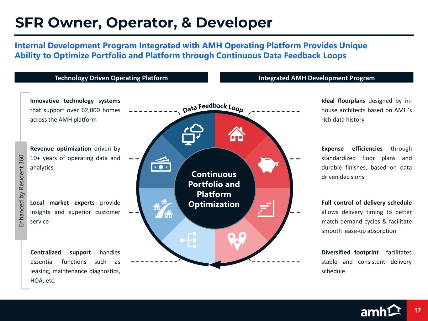 400 900 1,600 2,100 2,200 2,300 2,300 0 500 1,000 1,500 2,000 2,500 3,000 2018 2019 2020 2021 2022 2023 2024E AMH Development Deliveries(1) 16 AMH Development A Consistent Driver of Earnings Growth, Fueled by ~11,000 Unit Land Pipeline at Locked in Prices Refer to slide 23 for the 2024 Guidance disclosure. Guidance commentary is based on the 10/29/2024 earnings release and 10/30/2024 earnings call. (1) Rounded to the nearest hundred. (2) Rounded to the nearest thousand. M id p o in t o f G u id a n ce 2,000 4,000 6,000 9,000 13,000 14,000 13,000 11,000 0 2,000 4,000 6,000 8,000 10,000 12,000 14,000 16,000 2017 2018 2019 2020 2021 2022 2023 3Q24 AMH Development Land Pipeline(2) Total Lots Owned and Optioned