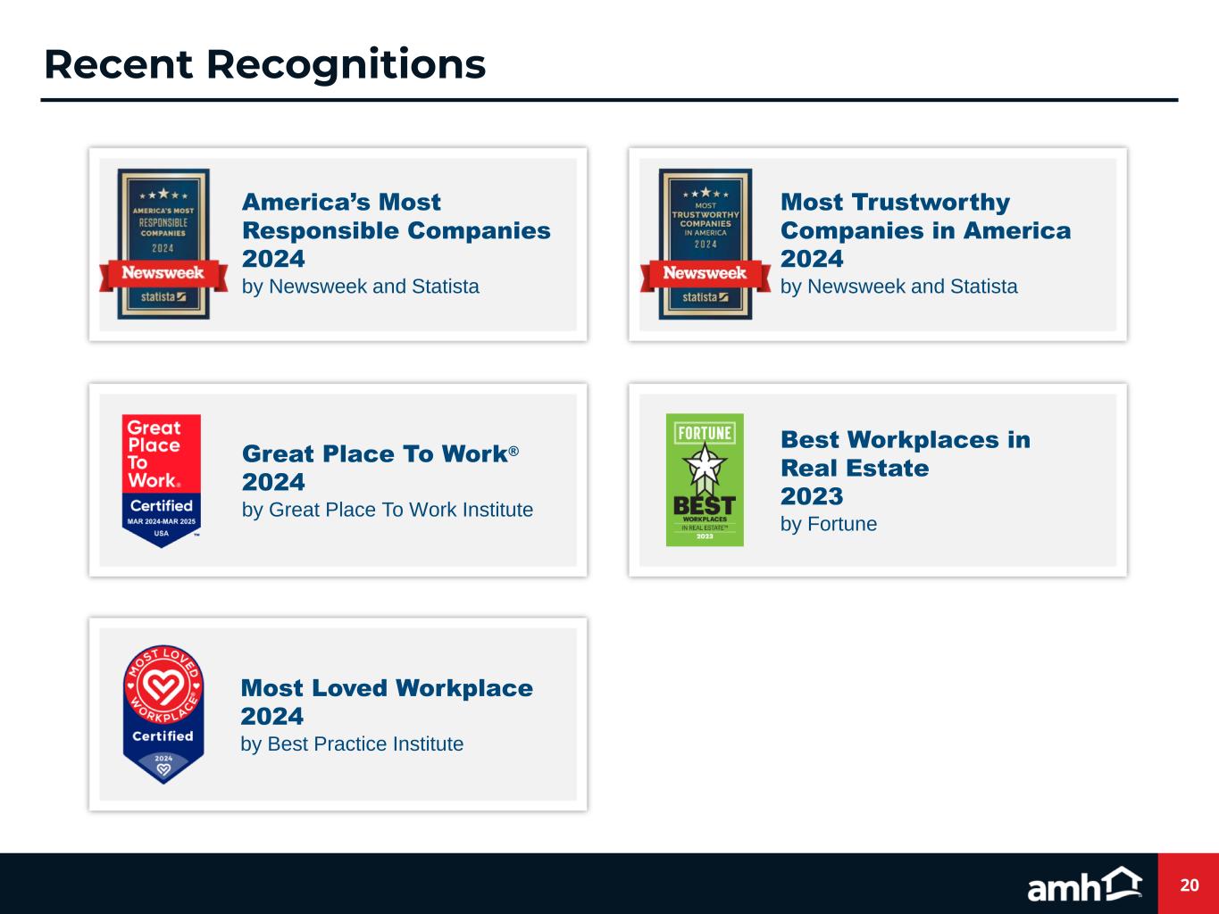 Great Place To Work® 2024 by Great Place To Work Institute 20 Recent Recognitions America’s Most Responsible Companies 2024 by Newsweek and Statista Best Workplaces in Real Estate 2023 by Fortune Most Loved Workplace 2024 by Best Practice Institute Most Trustworthy Companies in America 2024 by Newsweek and Statista