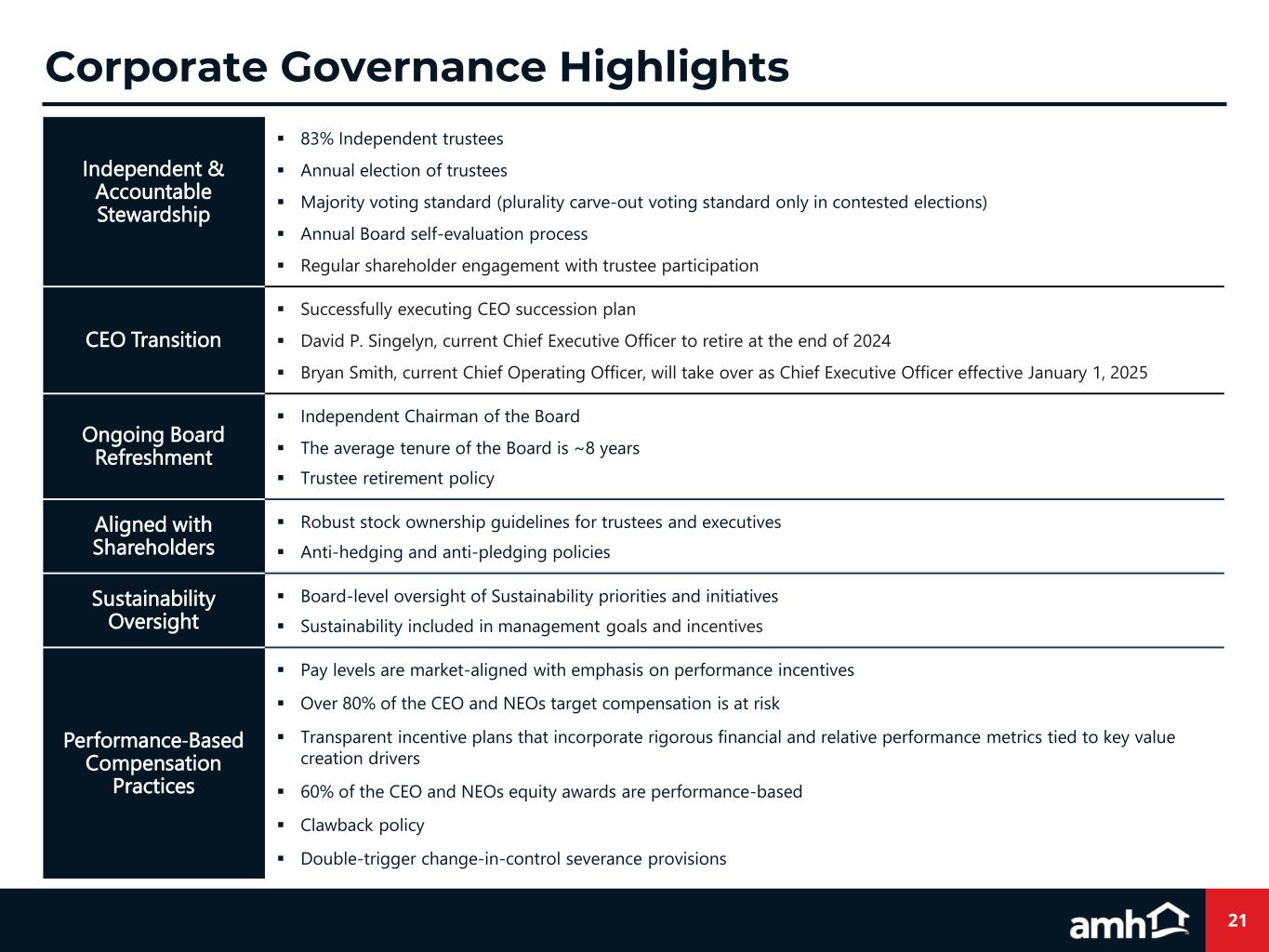 21 Independent & Accountable Stewardship ▪ 83% Independent trustees ▪ Annual election of trustees ▪ Majority voting standard (plurality carve‐out voting standard only in contested elections) ▪ Annual Board self-evaluation process ▪ Regular shareholder engagement with trustee participation CEO Transition ▪ Successfully executing CEO succession plan ▪ David P. Singelyn, current Chief Executive Officer to retire at the end of 2024 ▪ Bryan Smith, current Chief Operating Officer, will take over as Chief Executive Officer effective January 1, 2025 Ongoing Board Refreshment ▪ Independent Chairman of the Board ▪ The average tenure of the Board is ~8 years ▪ Trustee retirement policy Aligned with Shareholders ▪ Robust stock ownership guidelines for trustees and executives ▪ Anti-hedging and anti-pledging policies Sustainability Oversight ▪ Board-level oversight of Sustainability priorities and initiatives ▪ Sustainability included in management goals and incentives Performance-Based Compensation Practices ▪ Pay levels are market-aligned with emphasis on performance incentives ▪ Over 80% of the CEO and NEOs target compensation is at risk ▪ Transparent incentive plans that incorporate rigorous financial and relative performance metrics tied to key value creation drivers ▪ 60% of the CEO and NEOs equity awards are performance-based ▪ Clawback policy ▪ Double-trigger change-in-control severance provisions Corporate Governance Highlights