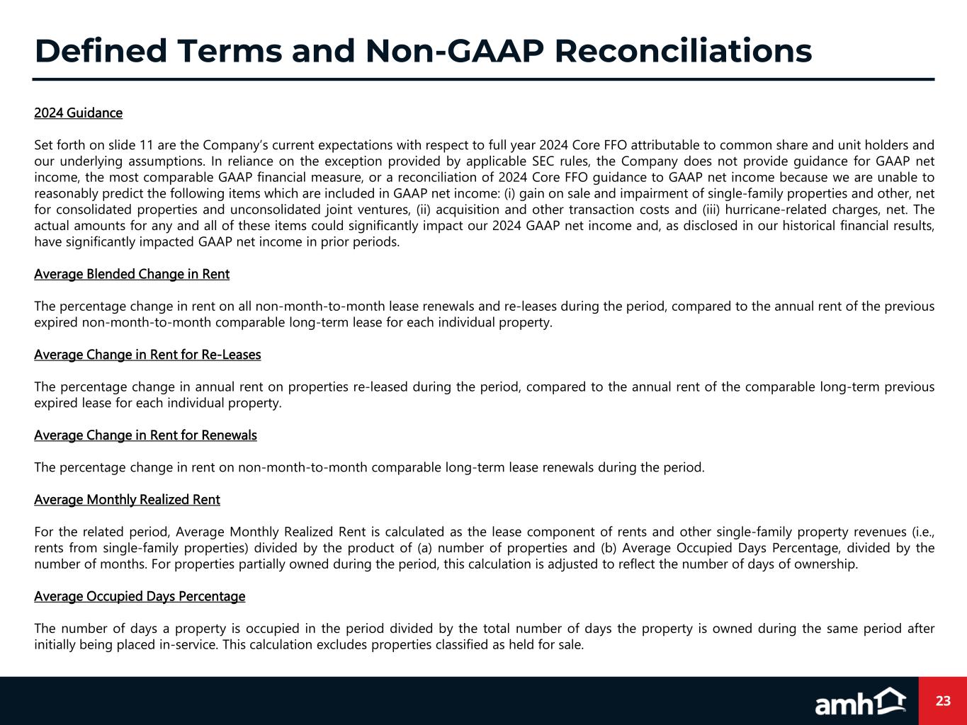 23 2024 Guidance Set forth on slide 11 are the Company’s current expectations with respect to full year 2024 Core FFO attributable to common share and unit holders and our underlying assumptions. In reliance on the exception provided by applicable SEC rules, the Company does not provide guidance for GAAP net income, the most comparable GAAP financial measure, or a reconciliation of 2024 Core FFO guidance to GAAP net income because we are unable to reasonably predict the following items which are included in GAAP net income: (i) gain on sale and impairment of single-family properties and other, net for consolidated properties and unconsolidated joint ventures, (ii) acquisition and other transaction costs and (iii) hurricane-related charges, net. The actual amounts for any and all of these items could significantly impact our 2024 GAAP net income and, as disclosed in our historical financial results, have significantly impacted GAAP net income in prior periods. Average Blended Change in Rent The percentage change in rent on all non-month-to-month lease renewals and re-leases during the period, compared to the annual rent of the previous expired non-month-to-month comparable long-term lease for each individual property. Average Change in Rent for Re-Leases The percentage change in annual rent on properties re-leased during the period, compared to the annual rent of the comparable long-term previous expired lease for each individual property. Average Change in Rent for Renewals The percentage change in rent on non-month-to-month comparable long-term lease renewals during the period. Average Monthly Realized Rent For the related period, Average Monthly Realized Rent is calculated as the lease component of rents and other single-family property revenues (i.e., rents from single-family properties) divided by the product of (a) number of properties and (b) Average Occupied Days Percentage, divided by the number of months. For properties partially owned during the period, this calculation is adjusted to reflect the number of days of ownership. Average Occupied Days Percentage The number of days a property is occupied in the period divided by the total number of days the property is owned during the same period after initially being placed in-service. This calculation excludes properties classified as held for sale. Defined Terms and Non-GAAP Reconciliations