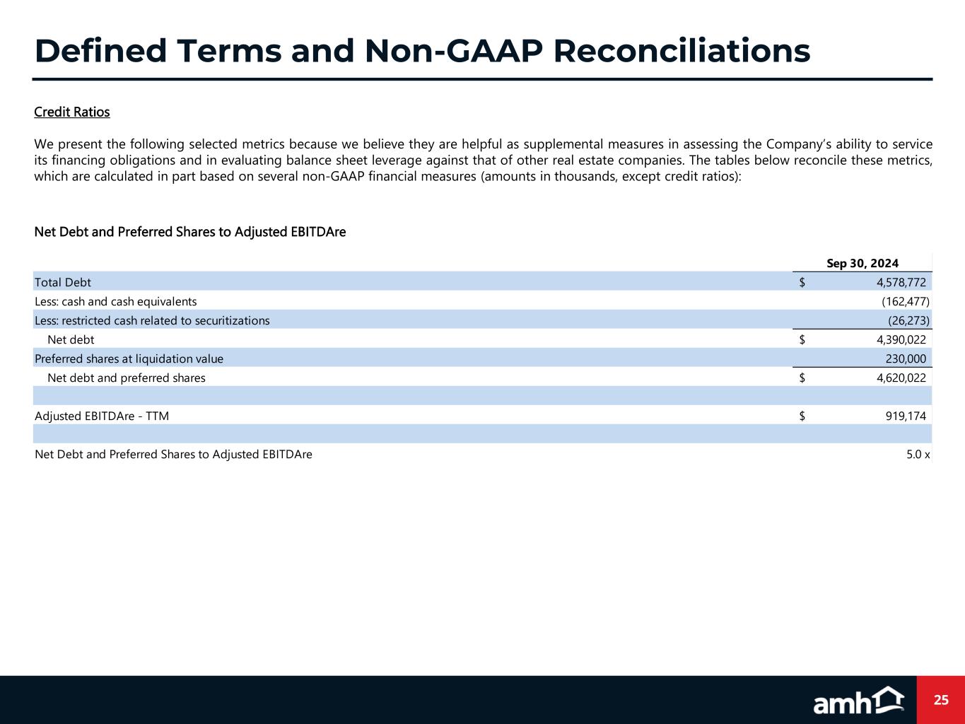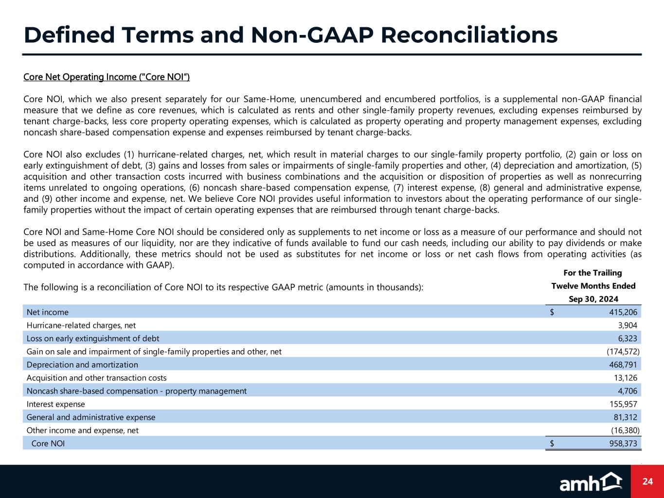 24 Defined Terms and Non-GAAP Reconciliations Core Net Operating Income ("Core NOI“) Core NOI, which we also present separately for our Same-Home, unencumbered and encumbered portfolios, is a supplemental non-GAAP financial measure that we define as core revenues, which is calculated as rents and other single-family property revenues, excluding expenses reimbursed by tenant charge-backs, less core property operating expenses, which is calculated as property operating and property management expenses, excluding noncash share-based compensation expense and expenses reimbursed by tenant charge-backs. Core NOI also excludes (1) hurricane-related charges, net, which result in material charges to our single-family property portfolio, (2) gain or loss on early extinguishment of debt, (3) gains and losses from sales or impairments of single-family properties and other, (4) depreciation and amortization, (5) acquisition and other transaction costs incurred with business combinations and the acquisition or disposition of properties as well as nonrecurring items unrelated to ongoing operations, (6) noncash share-based compensation expense, (7) interest expense, (8) general and administrative expense, and (9) other income and expense, net. We believe Core NOI provides useful information to investors about the operating performance of our single- family properties without the impact of certain operating expenses that are reimbursed through tenant charge-backs. Core NOI and Same-Home Core NOI should be considered only as supplements to net income or loss as a measure of our performance and should not be used as measures of our liquidity, nor are they indicative of funds available to fund our cash needs, including our ability to pay dividends or make distributions. Additionally, these metrics should not be used as substitutes for net income or loss or net cash flows from operating activities (as computed in accordance with GAAP). The following is a reconciliation of Core NOI to its respective GAAP metric (amounts in thousands): For the Trailing Twelve Months Ended Sep 30, 2024 Net income 415,206$ Hurricane-related charges, net 3,904 Loss on early extinguishment of debt 6,323 Gain on sale and impairment of single-family properties and other, net (174,572) Depreciation and amortization 468,791 Acquisition and other transaction costs 13,126 Noncash share-based compensation - property management 4,706 Interest expense 155,957 General and administrative expense 81,312 Other income and expense, net (16,380) Core NOI 958,373$