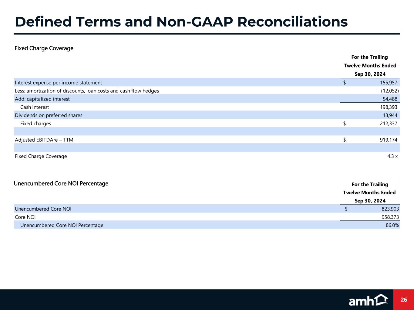25 Credit Ratios We present the following selected metrics because we believe they are helpful as supplemental measures in assessing the Company’s ability to service its financing obligations and in evaluating balance sheet leverage against that of other real estate companies. The tables below reconcile these metrics, which are calculated in part based on several non-GAAP financial measures (amounts in thousands, except credit ratios): Net Debt and Preferred Shares to Adjusted EBITDAre Defined Terms and Non-GAAP Reconciliations Sep 30, 2024 Total Debt 4,578,772$ Less: cash and cash equivalents (162,477) Less: restricted cash related to securitizations (26,273) Net debt 4,390,022$ Preferred shares at liquidation value 230,000 Net debt and preferred shares 4,620,022$ Adjusted EBITDAre - TTM 919,174$ Net Debt and Preferred Shares to Adjusted EBITDAre 5.0 x