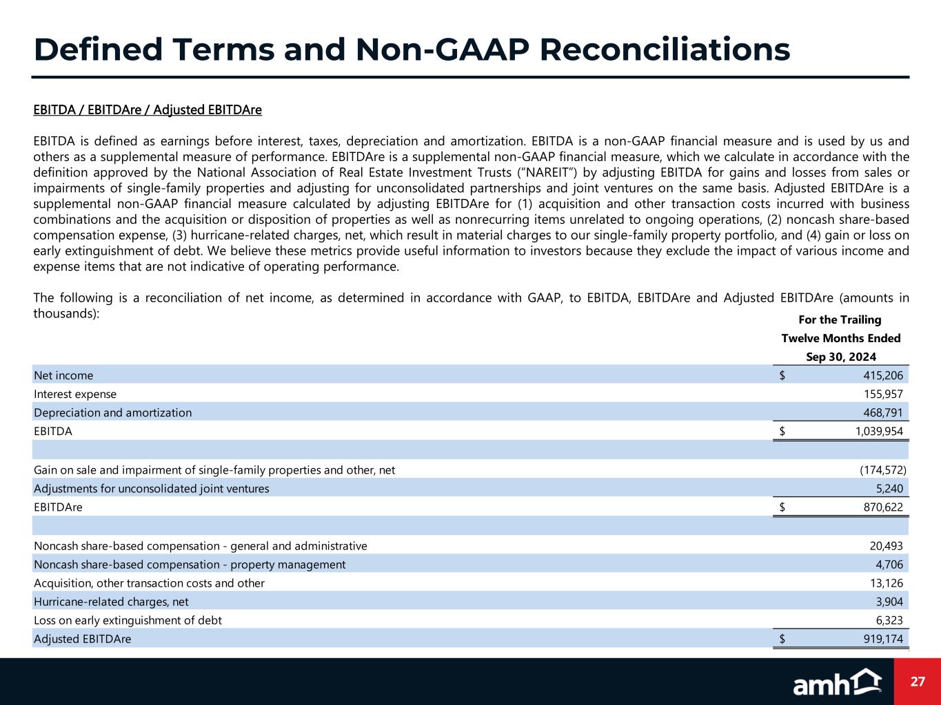 27 EBITDA / EBITDAre / Adjusted EBITDAre EBITDA is defined as earnings before interest, taxes, depreciation and amortization. EBITDA is a non-GAAP financial measure and is used by us and others as a supplemental measure of performance. EBITDAre is a supplemental non-GAAP financial measure, which we calculate in accordance with the definition approved by the National Association of Real Estate Investment Trusts (“NAREIT”) by adjusting EBITDA for gains and losses from sales or impairments of single-family properties and adjusting for unconsolidated partnerships and joint ventures on the same basis. Adjusted EBITDAre is a supplemental non-GAAP financial measure calculated by adjusting EBITDAre for (1) acquisition and other transaction costs incurred with business combinations and the acquisition or disposition of properties as well as nonrecurring items unrelated to ongoing operations, (2) noncash share-based compensation expense, (3) hurricane-related charges, net, which result in material charges to our single-family property portfolio, and (4) gain or loss on early extinguishment of debt. We believe these metrics provide useful information to investors because they exclude the impact of various income and expense items that are not indicative of operating performance. The following is a reconciliation of net income, as determined in accordance with GAAP, to EBITDA, EBITDAre and Adjusted EBITDAre (amounts in thousands): Defined Terms and Non-GAAP Reconciliations For the Trailing Twelve Months Ended Sep 30, 2024 Net income 415,206$ Interest expense 155,957 Depreciation and amortization 468,791 EBITDA 1,039,954$ Gain on sale and impairment of single-family properties and other, net (174,572) Adjustments for unconsolidated joint ventures 5,240 EBITDAre 870,622$ Noncash share-based compensation - general and administrative 20,493 Noncash share-based compensation - property management 4,706 Acquisition, other transaction costs and other 13,126 Hurricane-related charges, net 3,904 Loss on early extinguishment of debt 6,323 Adjusted EBITDAre 919,174$