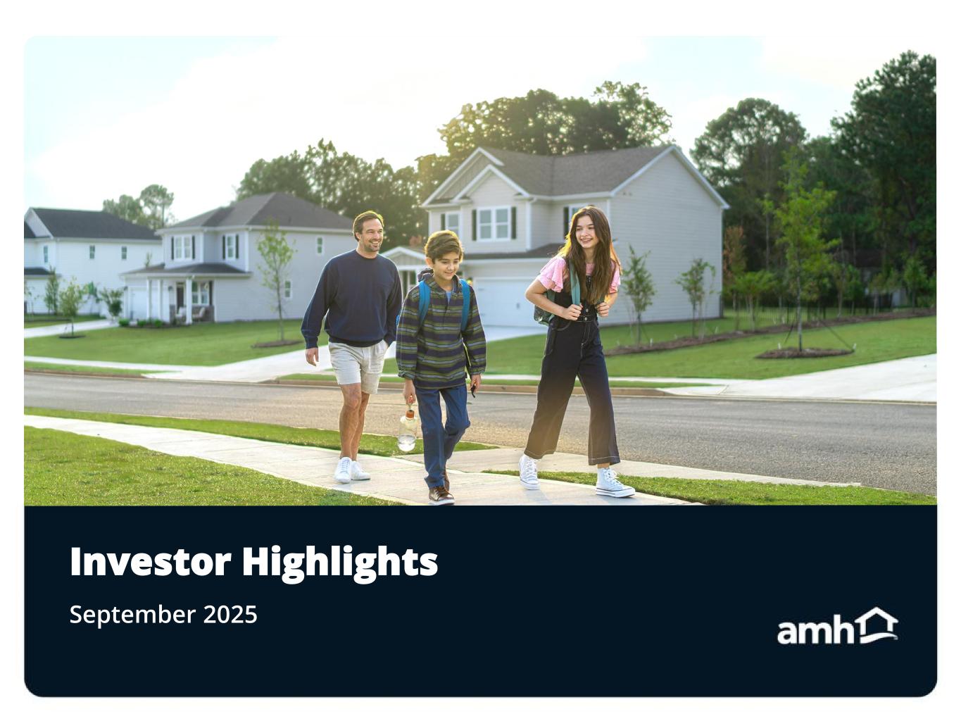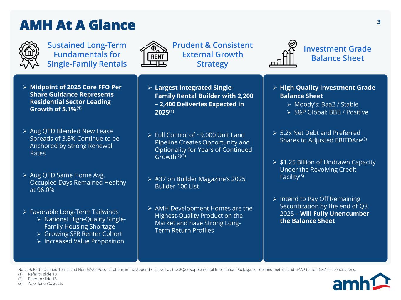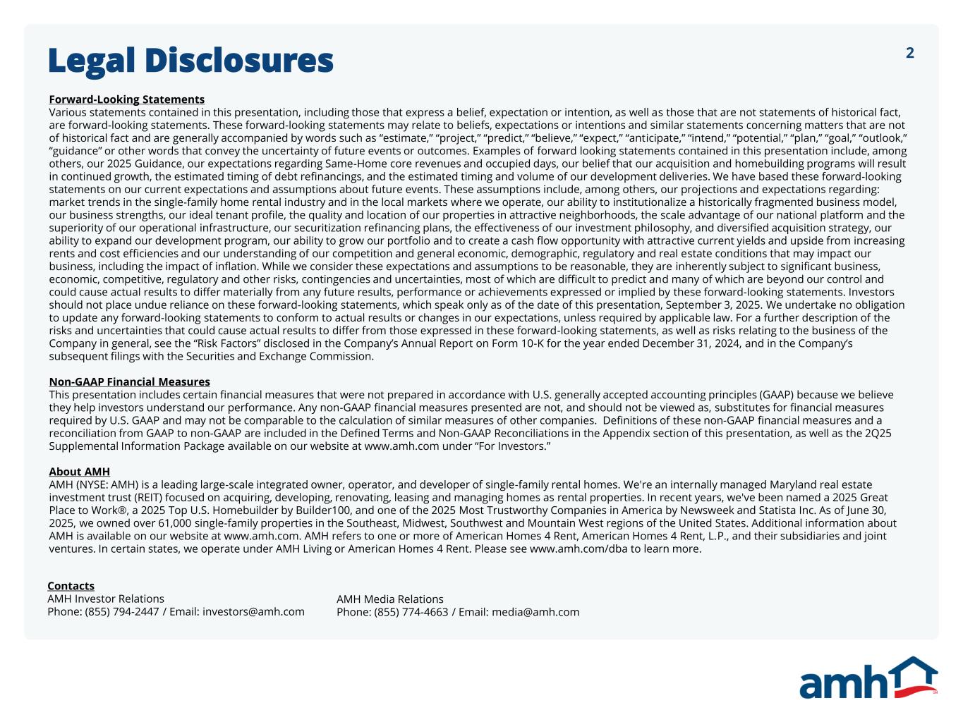 2Legal Disclosures Forward-Looking Statements Various statements contained in this presentation, including those that express a belief, expectation or intention, as well as those that are not statements of historical fact, are forward-looking statements. These forward-looking statements may relate to beliefs, expectations or intentions and similar statements concerning matters that are not of historical fact and are generally accompanied by words such as “estimate,” “project,” “predict,” “believe,” “expect,” “anticipate,” “intend,” “potential,” “plan,” “goal,” “outlook,” “guidance” or other words that convey the uncertainty of future events or outcomes. Examples of forward looking statements contained in this presentation include, among others, our 2025 Guidance, our expectations regarding Same-Home core revenues and occupied days, our belief that our acquisition and homebuilding programs will result in continued growth, the estimated timing of debt refinancings, and the estimated timing and volume of our development deliveries. We have based these forward-looking statements on our current expectations and assumptions about future events. These assumptions include, among others, our projections and expectations regarding: market trends in the single-family home rental industry and in the local markets where we operate, our ability to institutionalize a historically fragmented business model, our business strengths, our ideal tenant profile, the quality and location of our properties in attractive neighborhoods, the scale advantage of our national platform and the superiority of our operational infrastructure, our securitization refinancing plans, the effectiveness of our investment philosophy, and diversified acquisition strategy, our ability to expand our development program, our ability to grow our portfolio and to create a cash flow opportunity with attractive current yields and upside from increasing rents and cost efficiencies and our understanding of our competition and general economic, demographic, regulatory and real estate conditions that may impact our business, including the impact of inflation. While we consider these expectations and assumptions to be reasonable, they are inherently subject to significant business, economic, competitive, regulatory and other risks, contingencies and uncertainties, most of which are difficult to predict and many of which are beyond our control and could cause actual results to differ materially from any future results, performance or achievements expressed or implied by these forward-looking statements. Investors should not place undue reliance on these forward-looking statements, which speak only as of the date of this presentation, September 3, 2025. We undertake no obligation to update any forward-looking statements to conform to actual results or changes in our expectations, unless required by applicable law. For a further description of the risks and uncertainties that could cause actual results to differ from those expressed in these forward-looking statements, as well as risks relating to the business of the Company in general, see the “Risk Factors” disclosed in the Company’s Annual Report on Form 10-K for the year ended December 31, 2024, and in the Company’s subsequent filings with the Securities and Exchange Commission. Non-GAAP Financial Measures This presentation includes certain financial measures that were not prepared in accordance with U.S. generally accepted accounting principles (GAAP) because we believe they help investors understand our performance. Any non-GAAP financial measures presented are not, and should not be viewed as, substitutes for financial measures required by U.S. GAAP and may not be comparable to the calculation of similar measures of other companies. Definitions of these non-GAAP financial measures and a reconciliation from GAAP to non-GAAP are included in the Defined Terms and Non-GAAP Reconciliations in the Appendix section of this presentation, as well as the 2Q25 Supplemental Information Package available on our website at www.amh.com under “For Investors.” About AMH AMH (NYSE: AMH) is a leading large-scale integrated owner, operator, and developer of single-family rental homes. We're an internally managed Maryland real estate investment trust (REIT) focused on acquiring, developing, renovating, leasing and managing homes as rental properties. In recent years, we've been named a 2025 Great Place to Work®, a 2025 Top U.S. Homebuilder by Builder100, and one of the 2025 Most Trustworthy Companies in America by Newsweek and Statista Inc. As of June 30, 2025, we owned over 61,000 single-family properties in the Southeast, Midwest, Southwest and Mountain West regions of the United States. Additional information about AMH is available on our website at www.amh.com. AMH refers to one or more of American Homes 4 Rent, American Homes 4 Rent, L.P., and their subsidiaries and joint ventures. In certain states, we operate under AMH Living or American Homes 4 Rent. Please see www.amh.com/dba to learn more. Contacts AMH Investor Relations Phone: (855) 794-2447 / Email: investors@amh.com AMH Media Relations Phone: (855) 774-4663 / Email: media@amh.com
