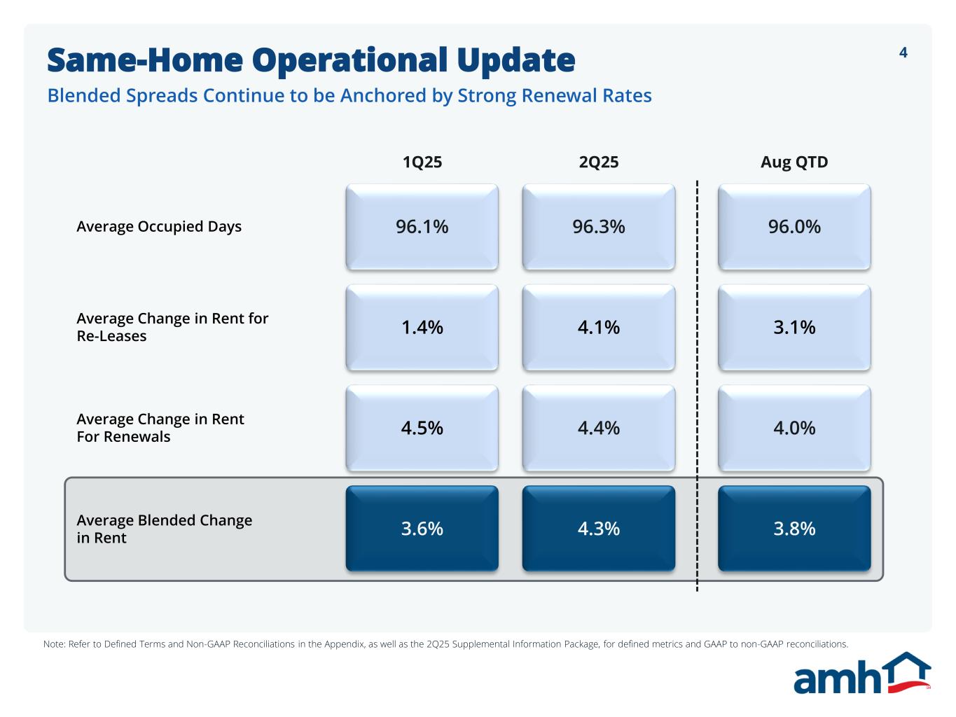 3AMH At A Glance ➢ Largest Integrated Single- Family Rental Builder with 2,200 – 2,400 Deliveries Expected in 2025(1) ➢ Full Control of ~9,000 Unit Land Pipeline Creates Opportunity and Optionality for Years of Continued Growth(2)(3) ➢ #37 on Builder Magazine’s 2025 Builder 100 List ➢ AMH Development Homes are the Highest-Quality Product on the Market and have Strong Long- Term Return Profiles ➢ High-Quality Investment Grade Balance Sheet ➢ Moody’s: Baa2 / Stable ➢ S&P Global: BBB / Positive ➢ 5.2x Net Debt and Preferred Shares to Adjusted EBITDAre(3) ➢ $1.25 Billion of Undrawn Capacity Under the Revolving Credit Facility(3) ➢ Intend to Pay Off Remaining Securitization by the end of Q3 2025 – Will Fully Unencumber the Balance Sheet Note: Refer to Defined Terms and Non-GAAP Reconciliations in the Appendix, as well as the 2Q25 Supplemental Information Package, for defined metrics and GAAP to non-GAAP reconciliations. (1) Refer to slide 10. (2) Refer to slide 16. (3) As of June 30, 2025. ➢ Midpoint of 2025 Core FFO Per Share Guidance Represents Residential Sector Leading Growth of 5.1%(1) ➢ Aug QTD Blended New Lease Spreads of 3.8% Continue to be Anchored by Strong Renewal Rates ➢ Aug QTD Same Home Avg. Occupied Days Remained Healthy at 96.0% ➢ Favorable Long-Term Tailwinds ➢ National High-Quality Single- Family Housing Shortage ➢ Growing SFR Renter Cohort ➢ Increased Value Proposition Sustained Long-Term Fundamentals for Single-Family Rentals Investment Grade Balance Sheet Prudent & Consistent External Growth Strategy