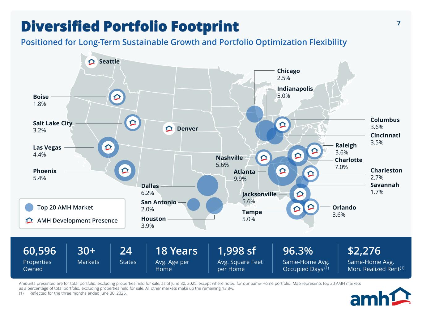 6The AMH Difference Strategy Focused on Operational Excellence, Portfolio Optimization, and Prudent Capital Acumen • Geographical Diversification Across 30+ Markets • Majority 3 and 4 Bedroom Detached Homes ~2,000 Square Feet in Size • Average Home Age Under 20 years in Highly Desirable Neighborhoods Operational Excellence • Leverage In-House Technology to Deliver a Superior Resident Experience Portfolio Optimization • Location • Quality • Asset Type Prudent Capital Acumen • Strong Balance Sheet • Disciplined Buy-Box • AMH Development • Asset Management