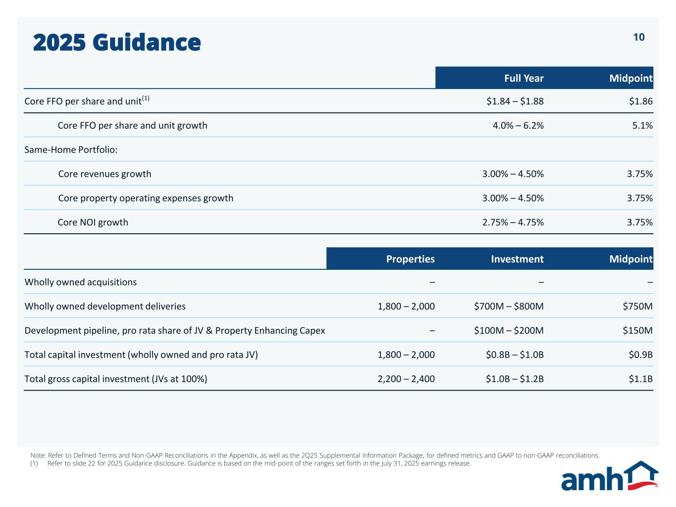102025 Guidance Full Year Midpoint Core FFO per share and unit(1) $1.84 – $1.88 $1.86 Core FFO per share and unit growth 4.0% – 6.2% 5.1% Same-Home Portfolio: Core revenues growth 3.00% – 4.50% 3.75% Core property operating expenses growth 3.00% – 4.50% 3.75% Core NOI growth 2.75% – 4.75% 3.75% Properties Investment Midpoint Wholly owned acquisitions – – – Wholly owned development deliveries 1,800 – 2,000 $700M – $800M $750M Development pipeline, pro rata share of JV & Property Enhancing Capex – $100M – $200M $150M Total capital investment (wholly owned and pro rata JV) 1,800 – 2,000 $0.8B – $1.0B $0.9B Total gross capital investment (JVs at 100%) 2,200 – 2,400 $1.0B – $1.2B $1.1B Note: Refer to Defined Terms and Non-GAAP Reconciliations in the Appendix, as well as the 2Q25 Supplemental Information Package, for defined metrics and GAAP to non-GAAP reconciliations. (1) Refer to slide 22 for 2025 Guidance disclosure. Guidance is based on the mid-point of the ranges set forth in the July 31, 2025 earnings release.