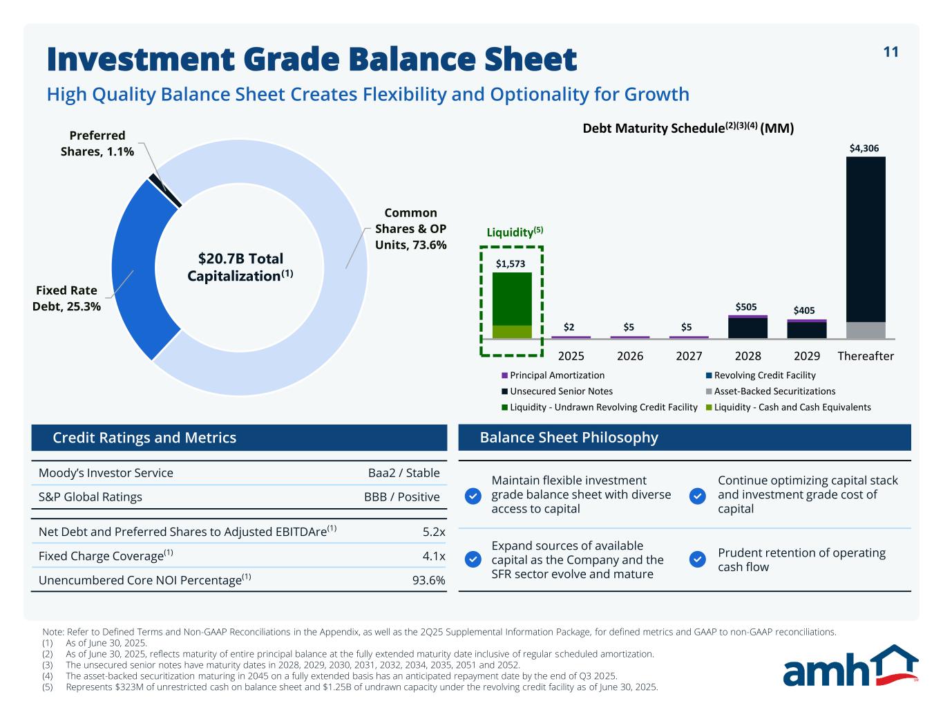 11Investment Grade Balance Sheet High Quality Balance Sheet Creates Flexibility and Optionality for Growth Credit Ratings and Metrics Moody’s Investor Service Baa2 / Stable S&P Global Ratings BBB / Positive Balance Sheet Philosophy Maintain flexible investment grade balance sheet with diverse access to capital Continue optimizing capital stack and investment grade cost of capital Expand sources of available capital as the Company and the SFR sector evolve and mature Prudent retention of operating cash flow Net Debt and Preferred Shares to Adjusted EBITDAre(1) 5.2x Fixed Charge Coverage(1) 4.1x Unencumbered Core NOI Percentage(1) 93.6% Note: Refer to Defined Terms and Non-GAAP Reconciliations in the Appendix, as well as the 2Q25 Supplemental Information Package, for defined metrics and GAAP to non-GAAP reconciliations. (1) As of June 30, 2025. (2) As of June 30, 2025, reflects maturity of entire principal balance at the fully extended maturity date inclusive of regular scheduled amortization. (3) The unsecured senior notes have maturity dates in 2028, 2029, 2030, 2031, 2032, 2034, 2035, 2051 and 2052. (4) The asset-backed securitization maturing in 2045 on a fully extended basis has an anticipated repayment date by the end of Q3 2025. (5) Represents $323M of unrestricted cash on balance sheet and $1.25B of undrawn capacity under the revolving credit facility as of June 30, 2025. Fixed Rate Debt, 25.3% Preferred Shares, 1.1% Common Shares & OP Units, 73.6% $20.7B Total Capitalization(1) 2025 2026 2027 2028 2029 Thereafter Debt Maturity Schedule(2)(3)(4) (MM) Principal Amortization Revolving Credit Facility Unsecured Senior Notes Asset-Backed Securitizations Liquidity - Undrawn Revolving Credit Facility Liquidity - Cash and Cash Equivalents $4,306 $2 $505 $5 $405 $1,573 Liquidity(5) $5