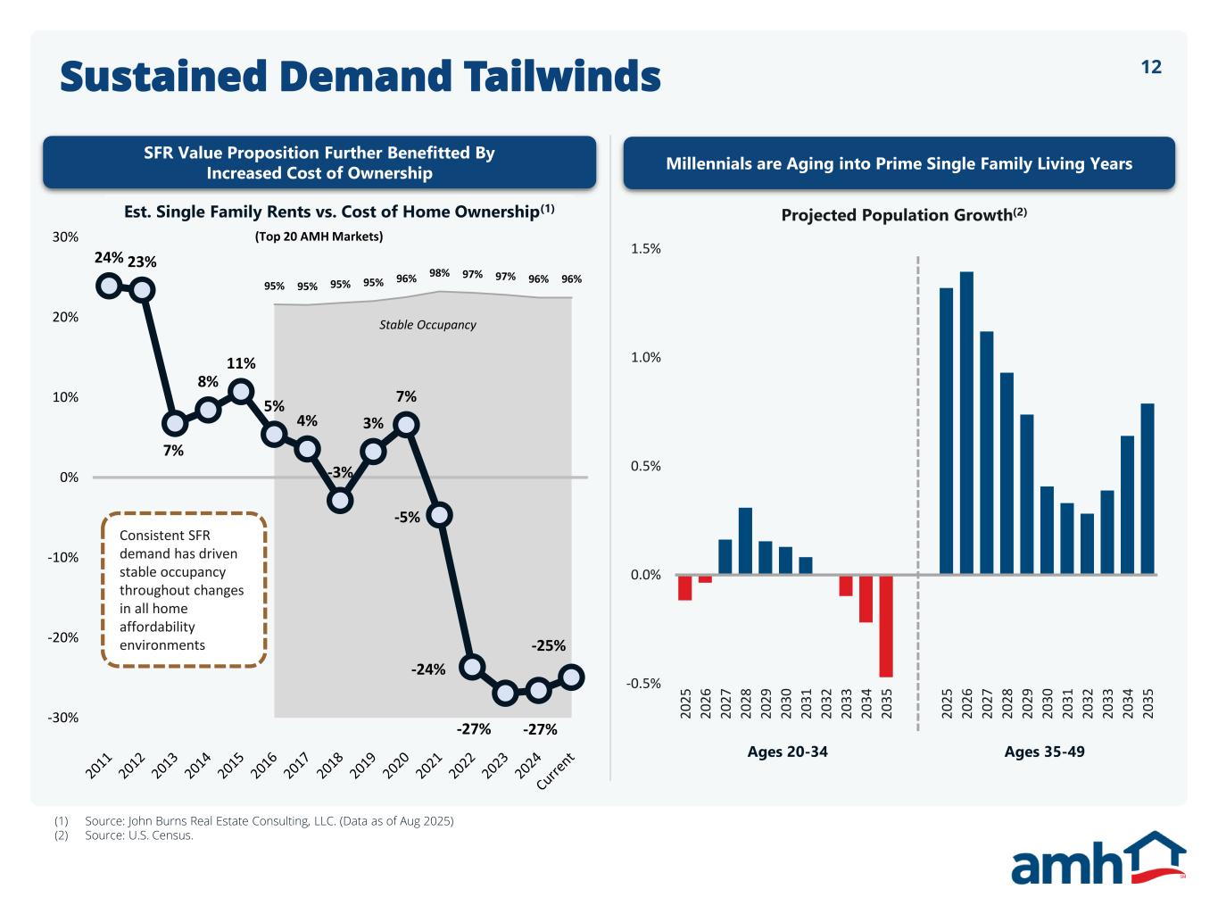 24% 23% 7% 8% 11% 5% 4% -3% 3% 7% -5% -24% -27% -27% -25% 95% 95% 95% 95% 96% 98% 97% 97% 96% 96% -30% -20% -10% 0% 10% 20% 30% (Top 20 AMH Markets) -0.5% 0.0% 0.5% 1.0% 1.5% 2 0 2 5 2 0 2 6 2 0 2 7 2 0 2 8 2 0 2 9 2 0 3 0 2 0 3 1 2 0 3 2 2 0 3 3 2 0 3 4 2 0 3 5 2 0 2 5 2 0 2 6 2 0 2 7 2 0 2 8 2 0 2 9 2 0 3 0 2 0 3 1 2 0 3 2 2 0 3 3 2 0 3 4 2 0 3 5 Projected Population Growth(2) 12Sustained Demand Tailwinds Millennials are Aging into Prime Single Family Living Years SFR Value Proposition Further Benefitted By Increased Cost of Ownership (1) Source: John Burns Real Estate Consulting, LLC. (Data as of Aug 2025) (2) Source: U.S. Census. Ages 20-34 Ages 35-49 Consistent SFR demand has driven stable occupancy throughout changes in all home affordability environments Stable Occupancy Est. Single Family Rents vs. Cost of Home Ownership(1)