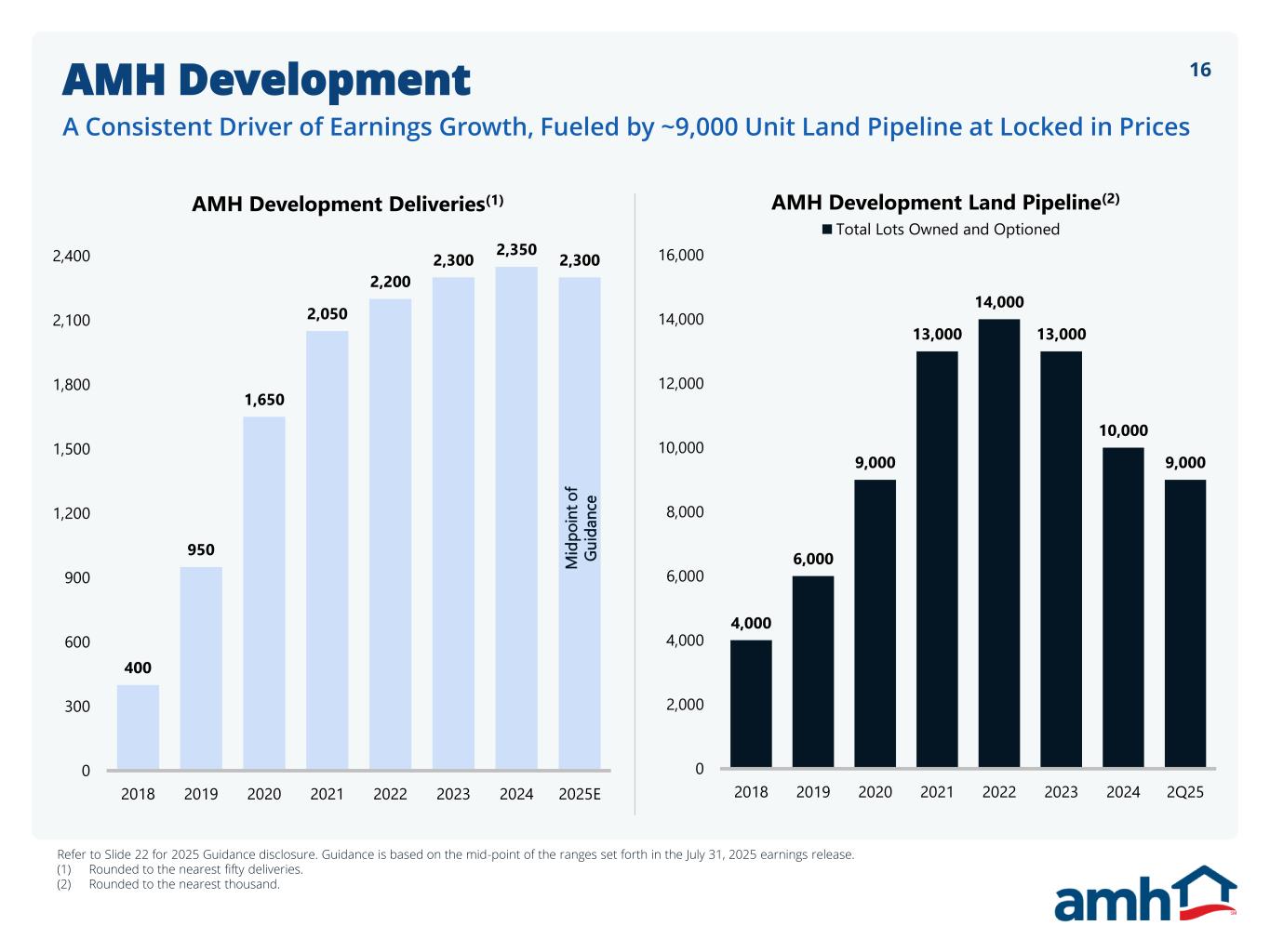 15AMH Development: Not All BTR is the Same Building the Ideal Rental Home Through the Lens of our Best-In-Class Operating Platform Strategy Product Type and Location Home Quality Expense Efficiency Value Creation Design and create ideal rental homes and communities using data and insights from AMH’s integrated development and operating platforms High-quality, detached, single family homes, with attached garages in highly desirable neighborhoods Stylish, upgraded fixtures and finishes: granite, hard surface flooring, stainless steel appliances Consistent, repeatable floorplans, fixtures and finishes selected for long- term operating expenditure efficiency AMH homes are constructed at significant discount to market value, resulting in immediate value creation Less opportunity for alignment of interests between developer and operators Horizontal apartments, townhomes or detached homes, commonly in tertiary neighborhoods Often “builder basic” or lower quality fixtures and finishes Varied floorplans, finishes and fixtures, typically selected for lowest up-front cost Commonly purchased at or near market value Other BTR Product AMH Amenity Centers create a community feel for residents. AMH Development Homes average 2,000 sq. ft. and come with private yards and fences.
