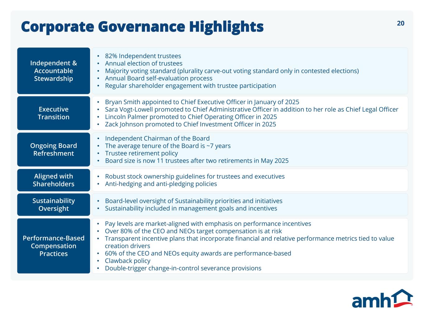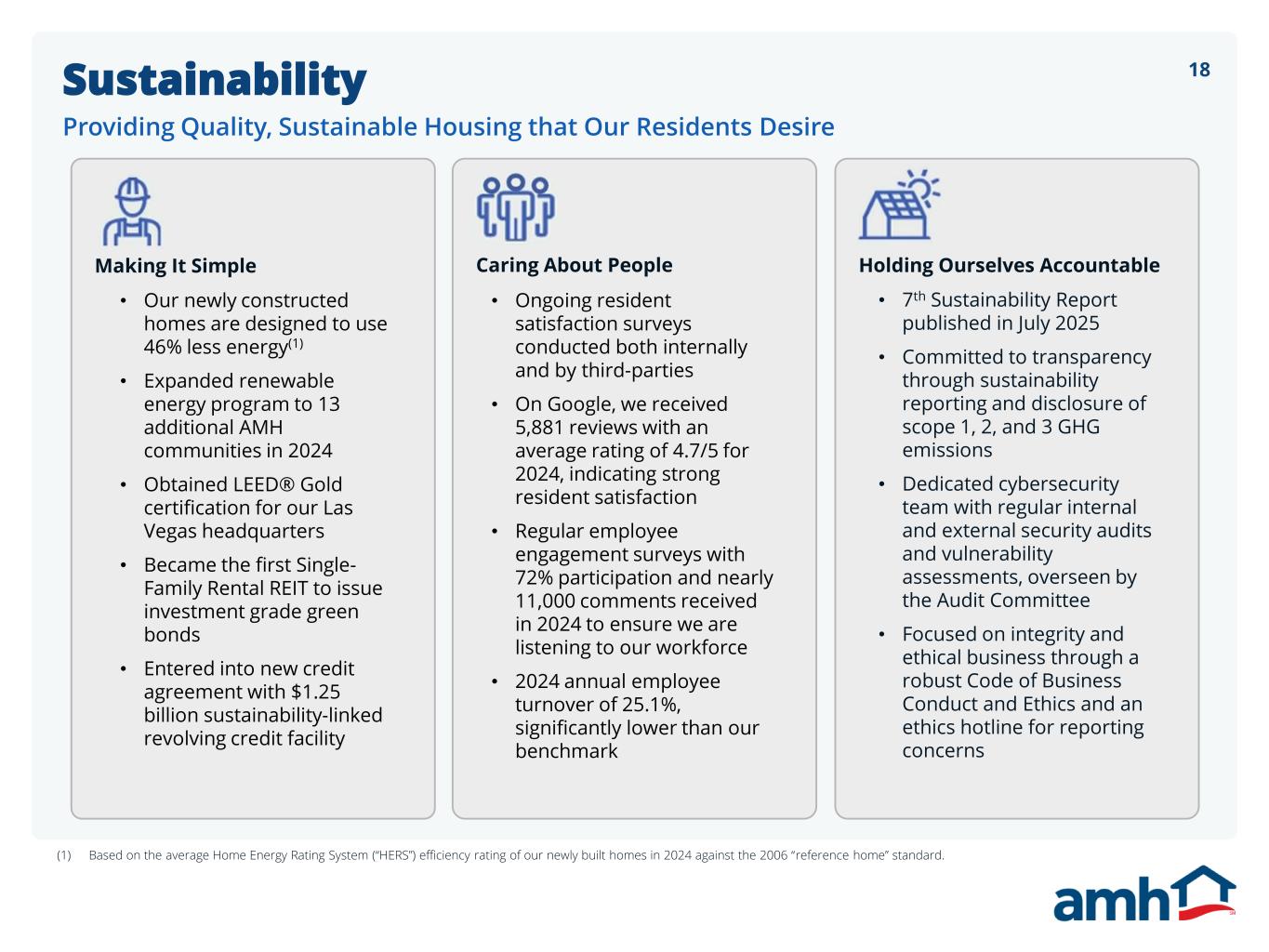 18Sustainability Providing Quality, Sustainable Housing that Our Residents Desire Caring About PeopleMaking It Simple Holding Ourselves Accountable • Our newly constructed homes are designed to use 46% less energy(1) • Expanded renewable energy program to 13 additional AMH communities in 2024 • Obtained LEED® Gold certification for our Las Vegas headquarters • Became the first Single- Family Rental REIT to issue investment grade green bonds • Entered into new credit agreement with $1.25 billion sustainability-linked revolving credit facility • Ongoing resident satisfaction surveys conducted both internally and by third-parties • On Google, we received 5,881 reviews with an average rating of 4.7/5 for 2024, indicating strong resident satisfaction • Regular employee engagement surveys with 72% participation and nearly 11,000 comments received in 2024 to ensure we are listening to our workforce • 2024 annual employee turnover of 25.1%, significantly lower than our benchmark • 7th Sustainability Report published in July 2025 • Committed to transparency through sustainability reporting and disclosure of scope 1, 2, and 3 GHG emissions • Dedicated cybersecurity team with regular internal and external security audits and vulnerability assessments, overseen by the Audit Committee • Focused on integrity and ethical business through a robust Code of Business Conduct and Ethics and an ethics hotline for reporting concerns (1) Based on the average Home Energy Rating System (“HERS”) efficiency rating of our newly built homes in 2024 against the 2006 “reference home” standard.
