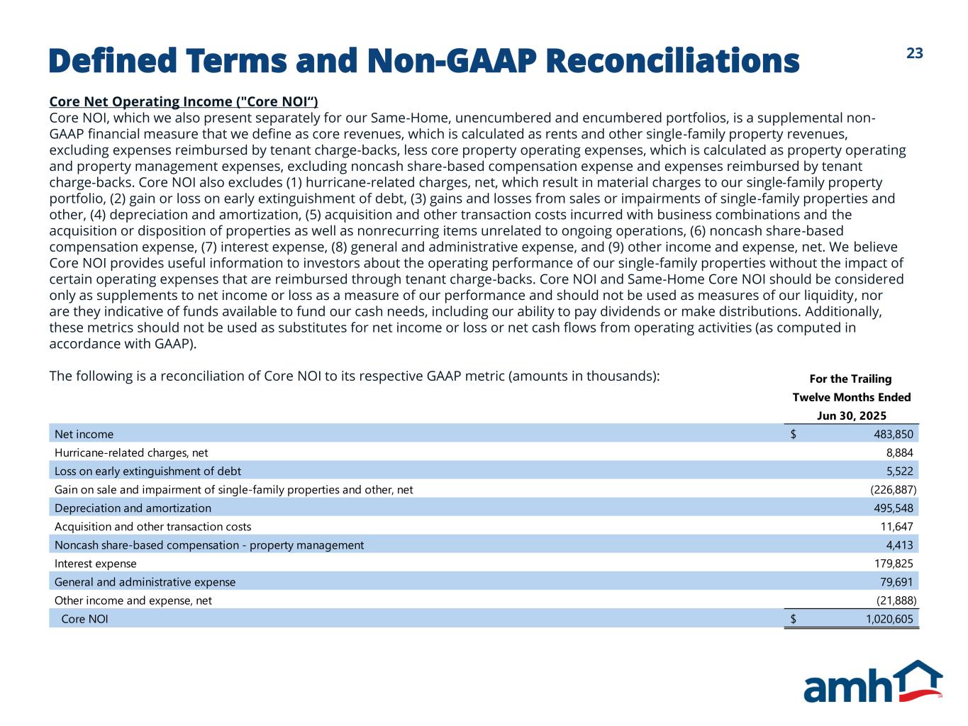 23Defined Terms and Non-GAAP Reconciliations Core Net Operating Income ("Core NOI“) Core NOI, which we also present separately for our Same-Home, unencumbered and encumbered portfolios, is a supplemental non- GAAP financial measure that we define as core revenues, which is calculated as rents and other single-family property revenues, excluding expenses reimbursed by tenant charge-backs, less core property operating expenses, which is calculated as property operating and property management expenses, excluding noncash share-based compensation expense and expenses reimbursed by tenant charge-backs. Core NOI also excludes (1) hurricane-related charges, net, which result in material charges to our single-family property portfolio, (2) gain or loss on early extinguishment of debt, (3) gains and losses from sales or impairments of single-family properties and other, (4) depreciation and amortization, (5) acquisition and other transaction costs incurred with business combinations and the acquisition or disposition of properties as well as nonrecurring items unrelated to ongoing operations, (6) noncash share-based compensation expense, (7) interest expense, (8) general and administrative expense, and (9) other income and expense, net. We believe Core NOI provides useful information to investors about the operating performance of our single-family properties without the impact of certain operating expenses that are reimbursed through tenant charge-backs. Core NOI and Same-Home Core NOI should be considered only as supplements to net income or loss as a measure of our performance and should not be used as measures of our liquidity, nor are they indicative of funds available to fund our cash needs, including our ability to pay dividends or make distributions. Additionally, these metrics should not be used as substitutes for net income or loss or net cash flows from operating activities (as computed in accordance with GAAP). The following is a reconciliation of Core NOI to its respective GAAP metric (amounts in thousands): For the Trailing Twelve Months Ended Jun 30, 2025 Net income 483,850$ Hurricane-related charges, net 8,884 Loss on early extinguishment of debt 5,522 Gain on sale and impairment of single-family properties and other, net (226,887) Depreciation and amortization 495,548 Acquisition and other transaction costs 11,647 Noncash share-based compensation - property management 4,413 Interest expense 179,825 General and administrative expense 79,691 Other income and expense, net (21,888) Core NOI 1,020,605$