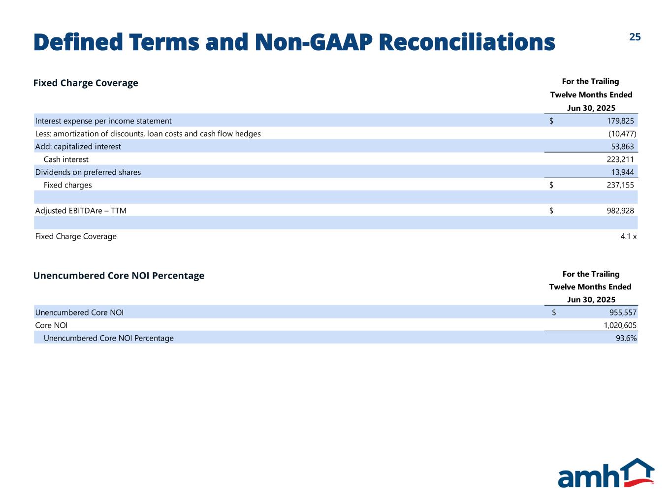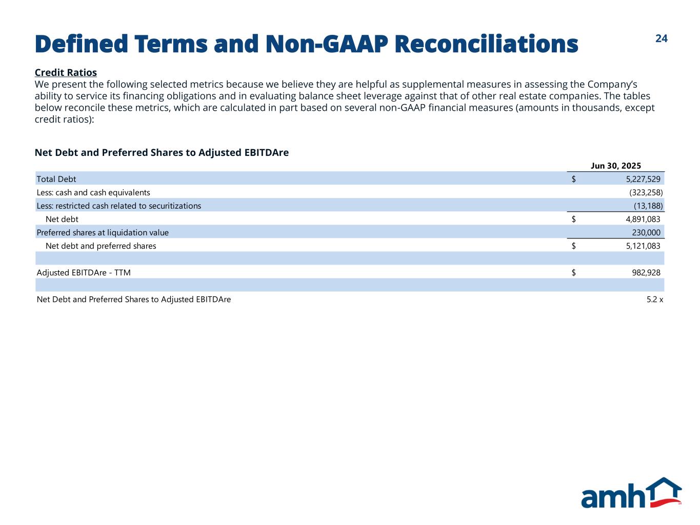 24Defined Terms and Non-GAAP Reconciliations Credit Ratios We present the following selected metrics because we believe they are helpful as supplemental measures in assessing the Company’s ability to service its financing obligations and in evaluating balance sheet leverage against that of other real estate companies. The tables below reconcile these metrics, which are calculated in part based on several non-GAAP financial measures (amounts in thousands, except credit ratios): Net Debt and Preferred Shares to Adjusted EBITDAre Jun 30, 2025 Total Debt 5,227,529$ Less: cash and cash equivalents (323,258) Less: restricted cash related to securitizations (13,188) Net debt 4,891,083$ Preferred shares at liquidation value 230,000 Net debt and preferred shares 5,121,083$ Adjusted EBITDAre - TTM 982,928$ Net Debt and Preferred Shares to Adjusted EBITDAre 5.2 x