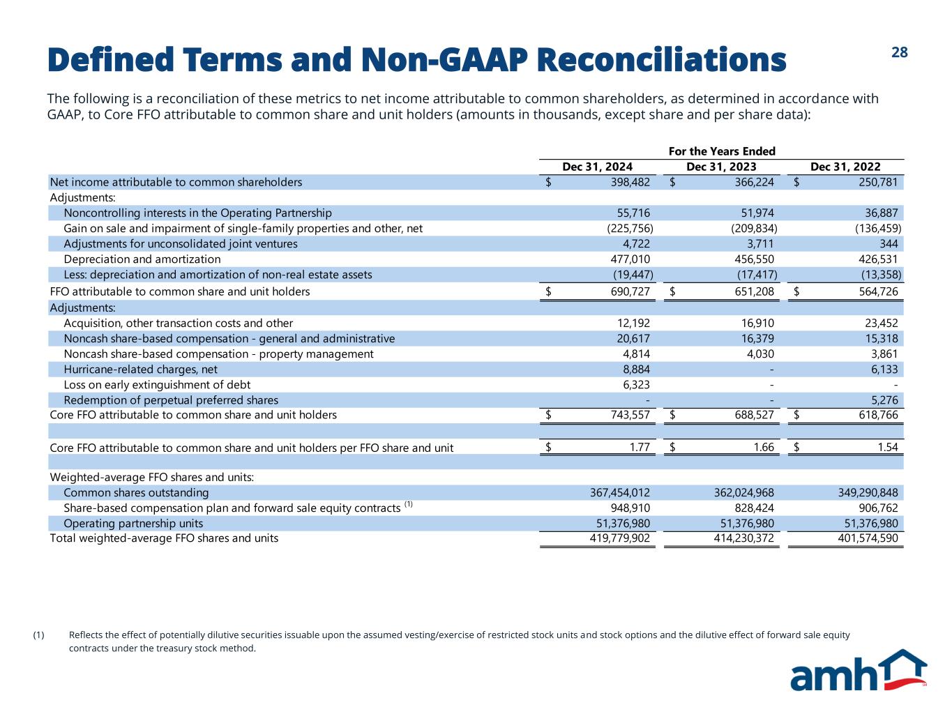 27Defined Terms and Non-GAAP Reconciliations Funds from Operations (“FFO”) / Core FFO attributable to common share and unit holders FFO attributable to common share and unit holders is a non-GAAP financial measure that we calculate in accordance with the definition approved by NAREIT, which defines FFO as net income or loss calculated in accordance with GAAP, excluding gains and losses from sales or impairment of real estate, plus real estate-related depreciation and amortization (excluding amortization of deferred financing costs and depreciation of non-real estate assets), and after adjustments for unconsolidated real estate joint ventures to reflect FFO on the same basis. Core FFO attributable to common share and unit holders is a non-GAAP financial measure that we use as a supplemental measure of our performance. We compute this metric by adjusting FFO attributable to common share and unit holders for (1) acquisition and other transaction costs incurred with business combinations and the acquisition or disposition of properties as well as nonrecurring items unrelated to ongoing operations and adjustments for investments in proptech venture capital funds related to the pro rata equity pickup of realized and unrealized gains and losses from their portfolio investments, (2) noncash share-based compensation expense, (3) hurricane-related charges, net, which result in material charges to our single-family property portfolio, (4) gain or loss on early extinguishment of debt and (5) the allocation of income to our perpetual preferred shares in connection with their redemption. We present FFO attributable to common share and unit holders, as well as on a per FFO share and unit basis, because we consider this metric to be an important measure of the performance of real estate companies, as do many investors and analysts in evaluating the Company. We believe that FFO attributable to common share and unit holders provides useful information to investors because this metric excludes depreciation, which is included in computing net income and assumes the value of real estate diminishes predictably over time. We believe that real estate values fluctuate due to market conditions and in response to inflation. We also believe that Core FFO attributable to common share and unit holders, as well as on a per FFO share and unit basis, provides useful information to investors because it allows investors to compare our operating performance to prior reporting periods without the effect of certain items that, by nature, are not comparable from period to period. FFO and Core FFO attributable to common share and unit holders are not a substitute for net income or net cash provided by operating activities, each as determined in accordance with GAAP, as a measure of our operating performance, liquidity or ability to pay dividends. These metrics also are not necessarily indicative of cash available to fund future cash needs. Because other REITs may not compute these measures in the same manner, they may not be comparable among REITs. FFO shares and units includes weighted-average common shares and operating partnership units outstanding, as well as potentially dilutive securities.