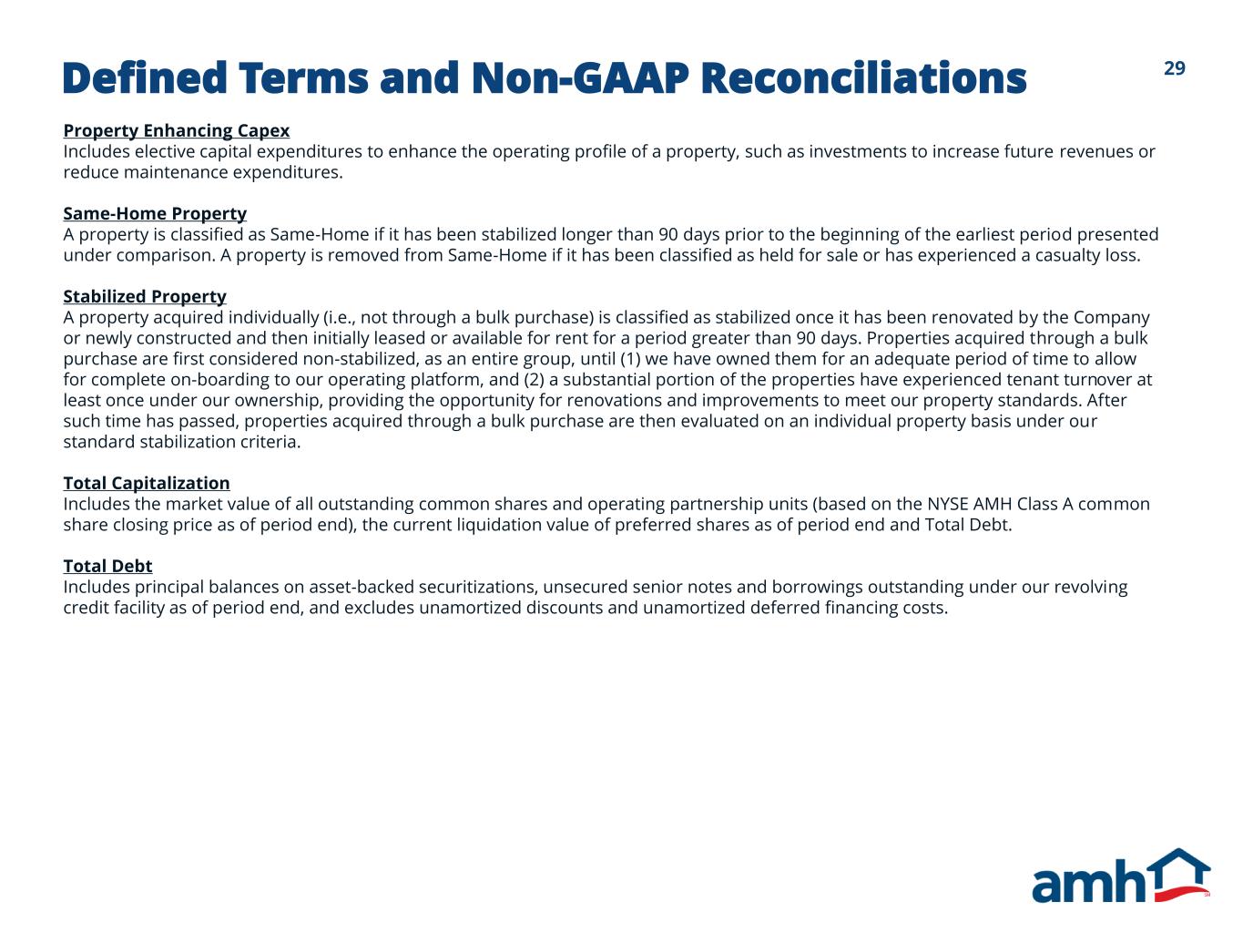 29Defined Terms and Non-GAAP Reconciliations Property Enhancing Capex Includes elective capital expenditures to enhance the operating profile of a property, such as investments to increase future revenues or reduce maintenance expenditures. Same-Home Property A property is classified as Same-Home if it has been stabilized longer than 90 days prior to the beginning of the earliest period presented under comparison. A property is removed from Same-Home if it has been classified as held for sale or has experienced a casualty loss. Stabilized Property A property acquired individually (i.e., not through a bulk purchase) is classified as stabilized once it has been renovated by the Company or newly constructed and then initially leased or available for rent for a period greater than 90 days. Properties acquired through a bulk purchase are first considered non-stabilized, as an entire group, until (1) we have owned them for an adequate period of time to allow for complete on-boarding to our operating platform, and (2) a substantial portion of the properties have experienced tenant turnover at least once under our ownership, providing the opportunity for renovations and improvements to meet our property standards. After such time has passed, properties acquired through a bulk purchase are then evaluated on an individual property basis under our standard stabilization criteria. Total Capitalization Includes the market value of all outstanding common shares and operating partnership units (based on the NYSE AMH Class A common share closing price as of period end), the current liquidation value of preferred shares as of period end and Total Debt. Total Debt Includes principal balances on asset-backed securitizations, unsecured senior notes and borrowings outstanding under our revolving credit facility as of period end, and excludes unamortized discounts and unamortized deferred financing costs.
