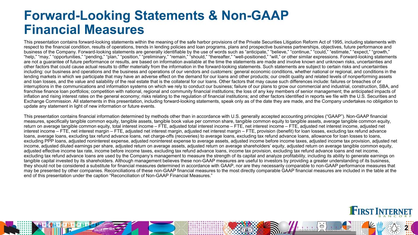 Forward-Looking Statements & Non-GAAP Financial Measures This presentation contains forward-looking statements within the meaning of the safe harbor provisions of the Private Securities Litigation Reform Act of 1995, including statements with respect to the financial condition, results of operations, trends in lending policies and loan programs, plans and prospective business partnerships, objectives, future performance and business of the Company. Forward-looking statements are generally identifiable by the use of words such as “anticipate,” “believe,” “continue,” “could,” “estimate,” “expect,” “growth,” “help,” “may,” “opportunities,” “pending,” “plan,” “position,” “preliminary,” “remain,” “should,” “thereafter,” “well-positioned,” “will,” or other similar expressions. Forward-looking statements are not a guarantee of future performance or results, are based on information available at the time the statements are made and involve known and unknown risks, uncertainties and other factors that could cause actual results to differ materially from the information in the forward-looking statements. Such statements are subject to certain risks and uncertainties including: our business and operations and the business and operations of our vendors and customers: general economic conditions, whether national or regional, and conditions in the lending markets in which we participate that may have an adverse effect on the demand for our loans and other products; our credit quality and related levels of nonperforming assets and loan losses, and the value and salability of the real estate that is the collateral for our loans. Other factors that may cause such differences include: failures or breaches of or interruptions in the communications and information systems on which we rely to conduct our business; failure of our plans to grow our commercial and industrial, construction, SBA, and franchise finance loan portfolios; competition with national, regional and community financial institutions; the loss of any key members of senior management; the anticipated impacts of inflation and rising interest rates on the general economy; risks relating to the regulation of financial institutions; and other factors identified in reports we file with the U.S. Securities and Exchange Commission. All statements in this presentation, including forward-looking statements, speak only as of the date they are made, and the Company undertakes no obligation to update any statement in light of new information or future events. This presentation contains financial information determined by methods other than in accordance with U.S. generally accepted accounting principles (“GAAP”). Non-GAAP financial measures, specifically tangible common equity, tangible assets, tangible book value per common share, tangible common equity to tangible assets, average tangible common equity, return on average tangible common equity, total interest income – FTE, adjusted total interest income – FTE, net interest income – FTE, adjusted net interest income, adjusted net interest income – FTE, net interest margin – FTE, adjusted net interest margin, adjusted net interest margin – FTE, provision (benefit) for loan losses, excluding tax refund advance loans, average loans, excluding tax refund advance loans, net charge-offs (recoveries) to average loans, excluding tax refund advance loans, allowance for loan losses to loans, excluding PPP loans, adjusted noninterest expense, adjusted noninterest expense to average assets, adjusted income before income taxes, adjusted income tax provision, adjusted net income, adjusted diluted earnings per share, adjusted return on average assets, adjusted return on average shareholders’ equity, adjusted return on average tangible common equity, adjusted effective income tax rate, income before income taxes, excluding tax refund advance loans, income tax provision, excluding tax refund advance loans and net income, excluding tax refund advance loans are used by the Company’s management to measure the strength of its capital and analyze profitability, including its ability to generate earnings on tangible capital invested by its shareholders. Although management believes these non-GAAP measures are useful to investors by providing a greater understanding of its business, they should not be considered a substitute for financial measures determined in accordance with GAAP, nor are they necessarily comparable to non-GAAP performance measures that may be presented by other companies. Reconciliations of these non-GAAP financial measures to the most directly comparable GAAP financial measures are included in the table at the end of this presentation under the caption “Reconciliation of Non-GAAP Financial Measures.” 2