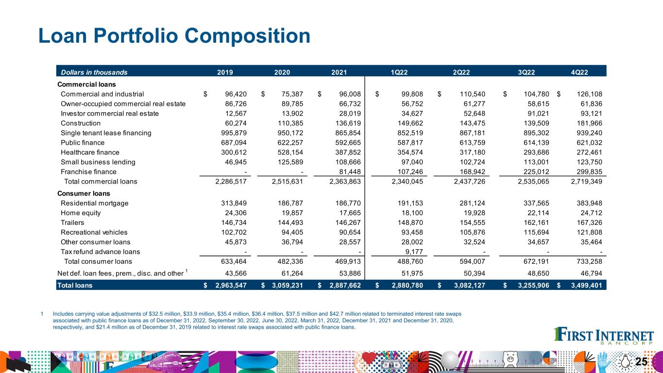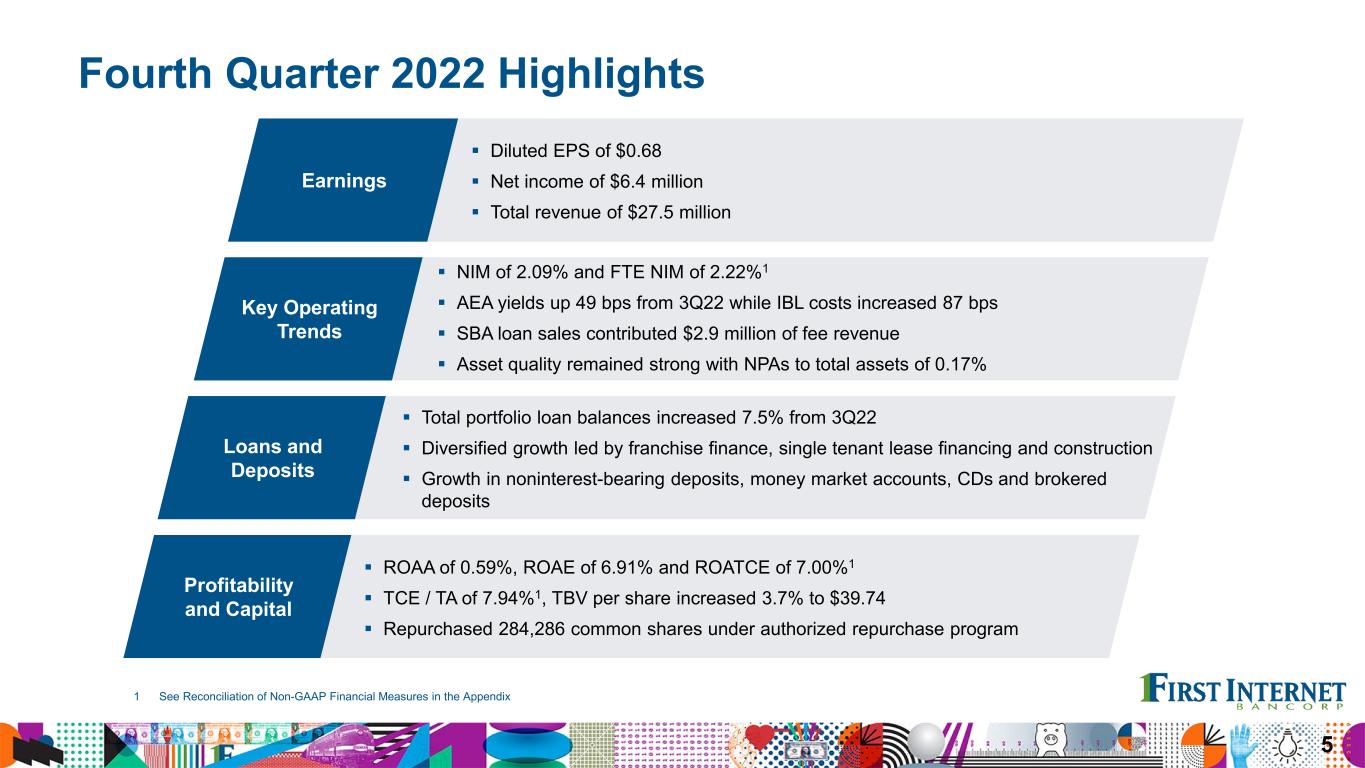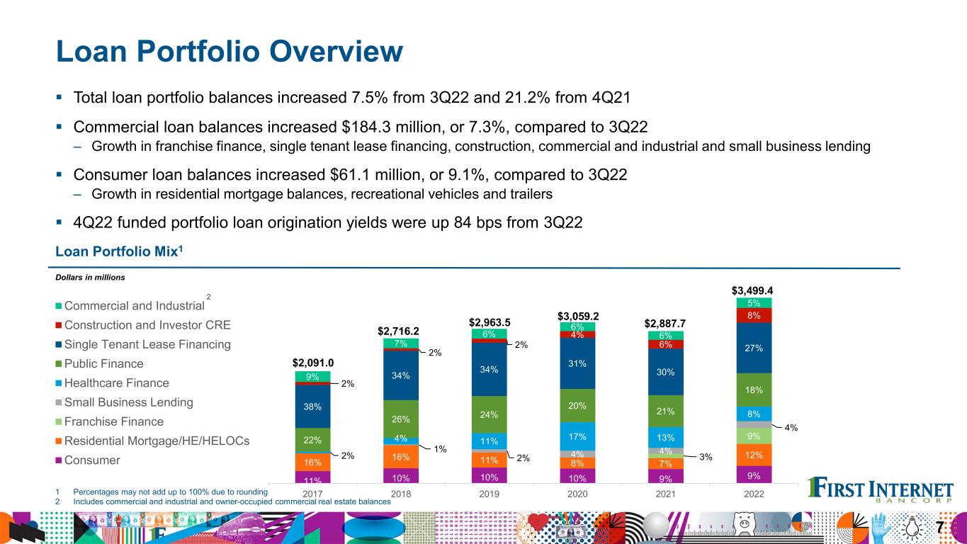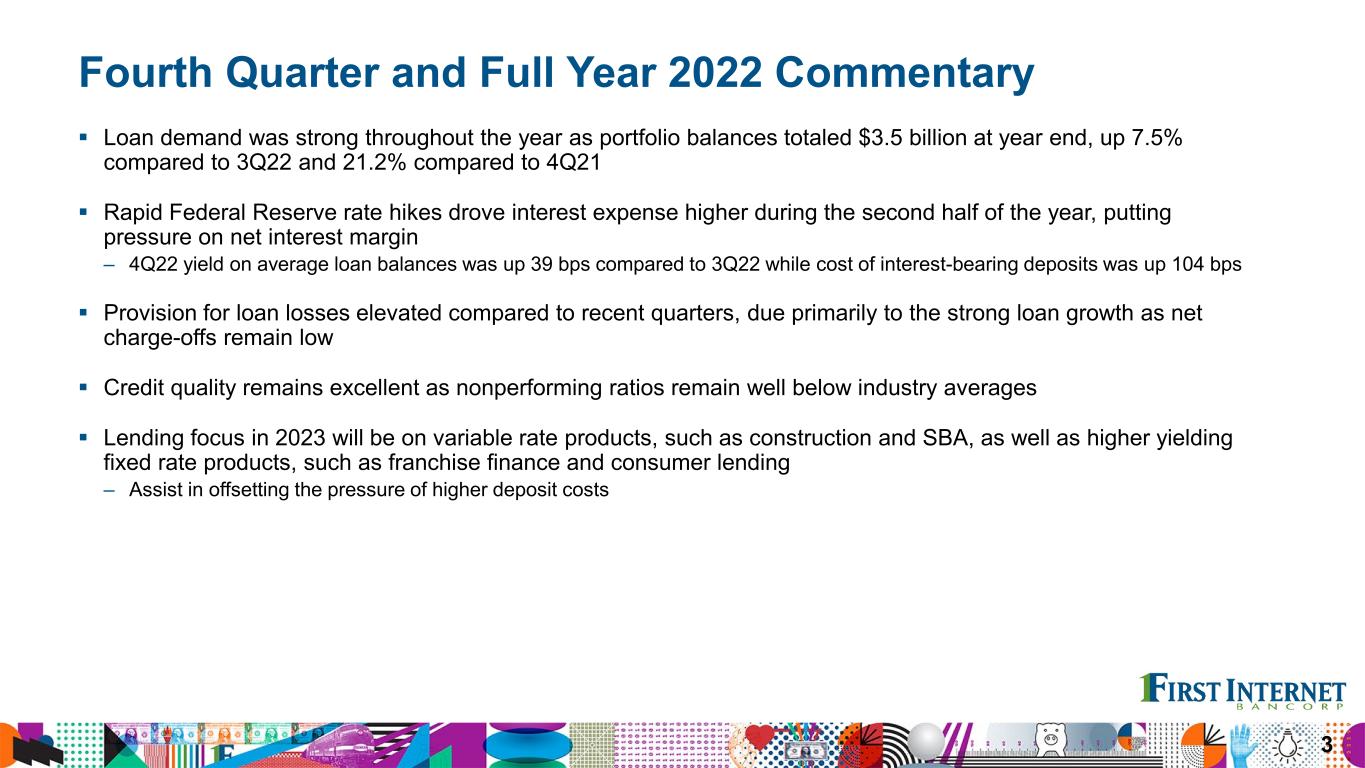 Fourth Quarter and Full Year 2022 Commentary  Loan demand was strong throughout the year as portfolio balances totaled $3.5 billion at year end, up 7.5% compared to 3Q22 and 21.2% compared to 4Q21  Rapid Federal Reserve rate hikes drove interest expense higher during the second half of the year, putting pressure on net interest margin – 4Q22 yield on average loan balances was up 39 bps compared to 3Q22 while cost of interest-bearing deposits was up 104 bps  Provision for loan losses elevated compared to recent quarters, due primarily to the strong loan growth as net charge-offs remain low  Credit quality remains excellent as nonperforming ratios remain well below industry averages  Lending focus in 2023 will be on variable rate products, such as construction and SBA, as well as higher yielding fixed rate products, such as franchise finance and consumer lending – Assist in offsetting the pressure of higher deposit costs 3