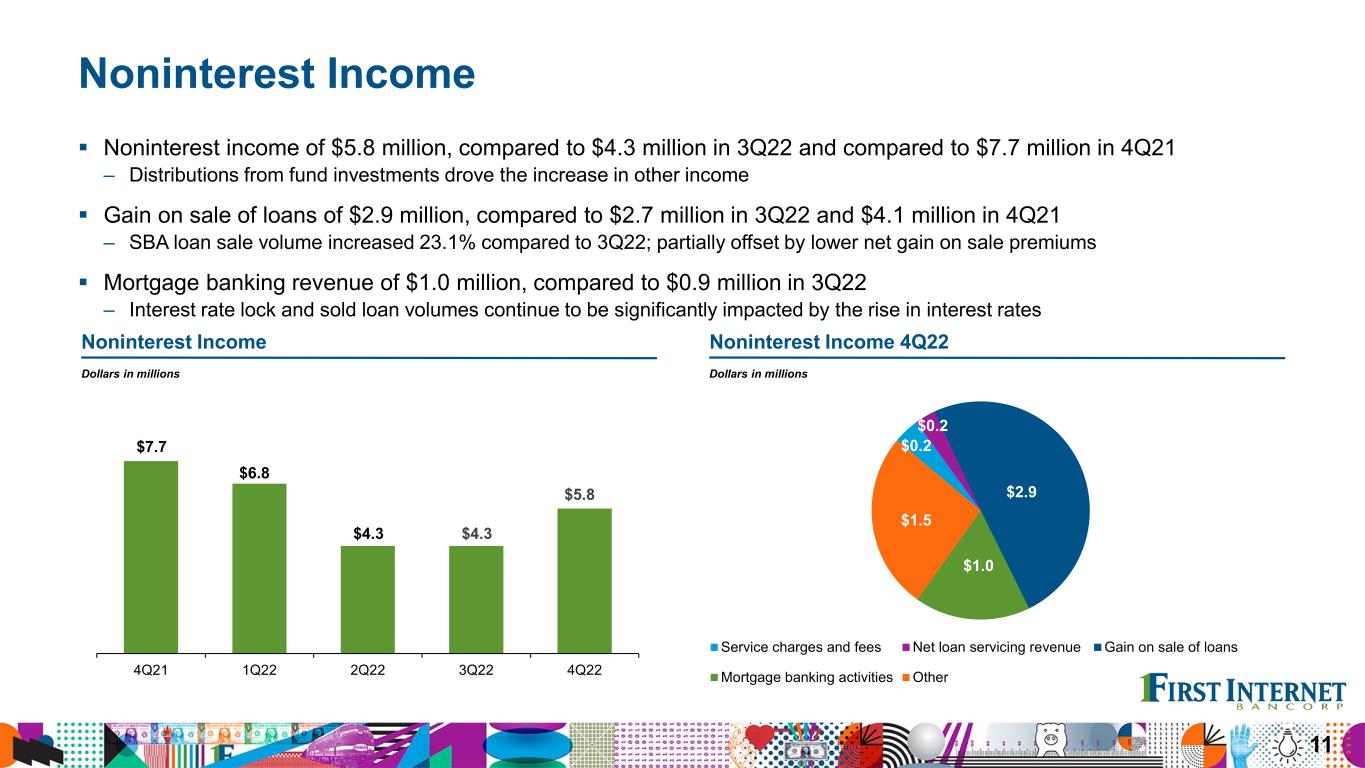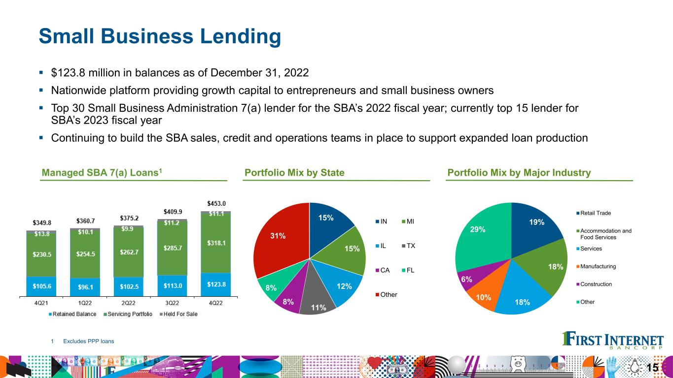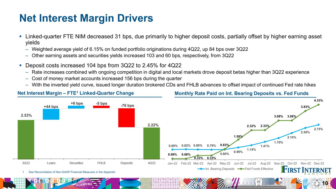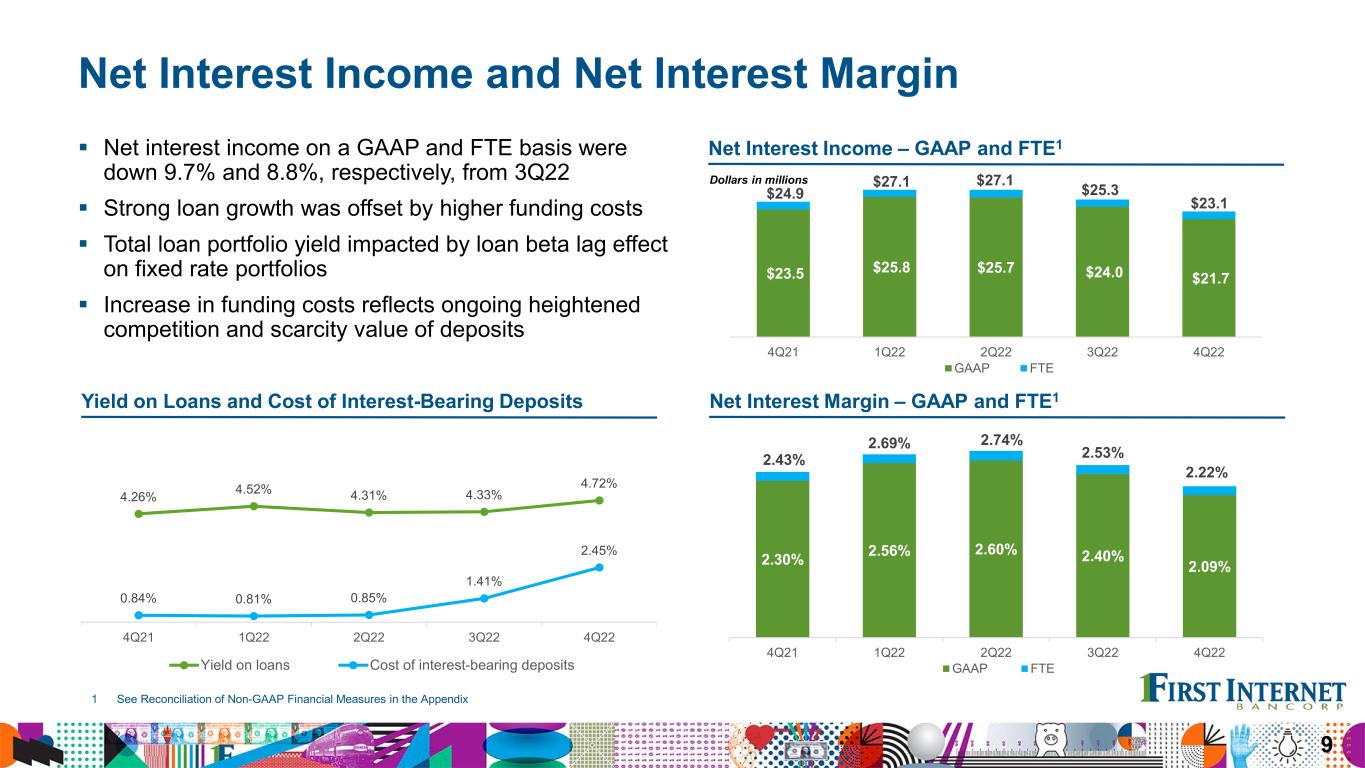 Fourth Quarter and Full Year 2022 Commentary  Loan demand was strong throughout the year as portfolio balances totaled $3.5 billion at year end, up 7.5% compared to 3Q22 and 21.2% compared to 4Q21  Rapid Federal Reserve rate hikes drove interest expense higher during the second half of the year, putting pressure on net interest margin – 4Q22 yield on average loan balances was up 39 bps compared to 3Q22 while cost of interest-bearing deposits was up 104 bps  Provision for loan losses elevated compared to recent quarters, due primarily to the strong loan growth as net charge-offs remain low  Credit quality remains excellent as nonperforming ratios remain well below industry averages  Lending focus in 2023 will be on variable rate products, such as construction and SBA, as well as higher yielding fixed rate products, such as franchise finance and consumer lending – Assist in offsetting the pressure of higher deposit costs 3