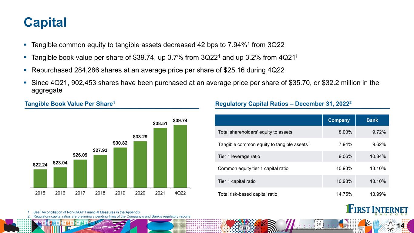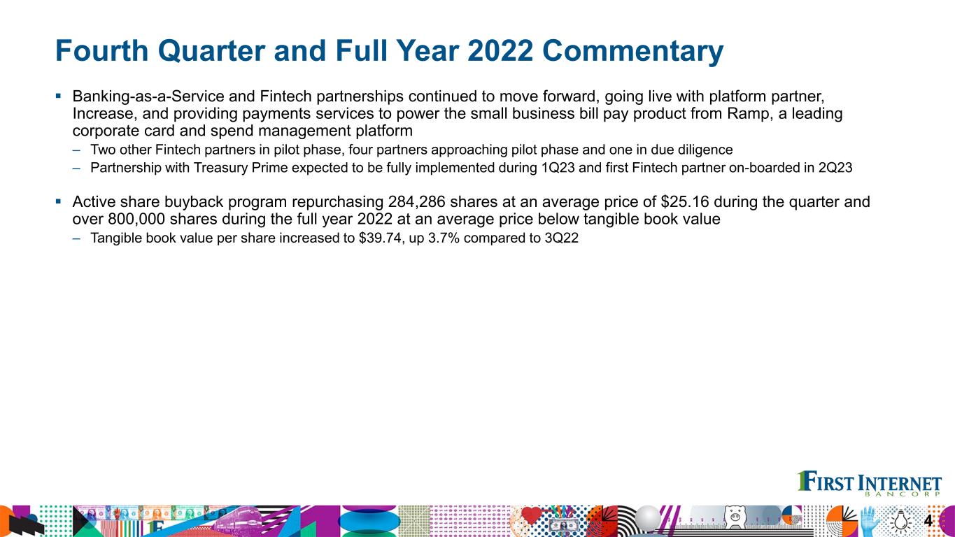 Fourth Quarter and Full Year 2022 Commentary  Banking-as-a-Service and Fintech partnerships continued to move forward, going live with platform partner, Increase, and providing payments services to power the small business bill pay product from Ramp, a leading corporate card and spend management platform – Two other Fintech partners in pilot phase, four partners approaching pilot phase and one in due diligence – Partnership with Treasury Prime expected to be fully implemented during 1Q23 and first Fintech partner on-boarded in 2Q23  Active share buyback program repurchasing 284,286 shares at an average price of $25.16 during the quarter and over 800,000 shares during the full year 2022 at an average price below tangible book value – Tangible book value per share increased to $39.74, up 3.7% compared to 3Q22 4