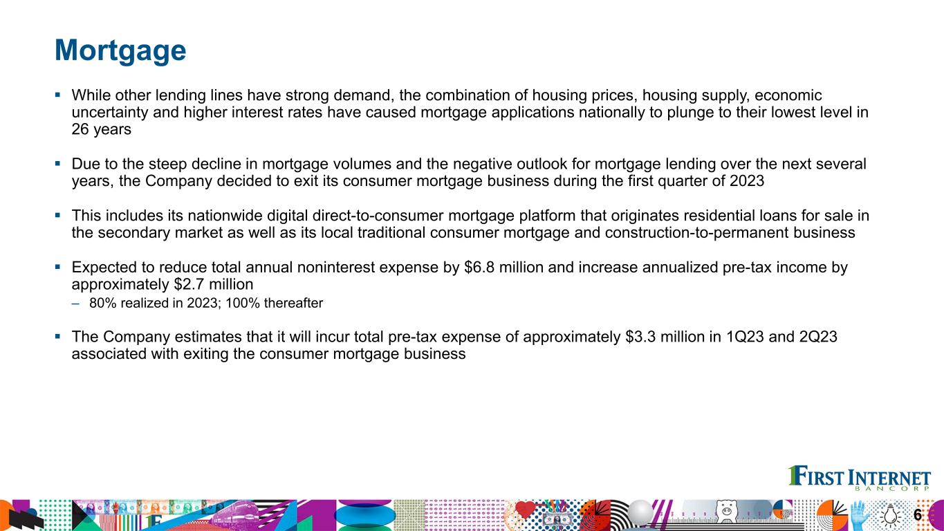Mortgage  While other lending lines have strong demand, the combination of housing prices, housing supply, economic uncertainty and higher interest rates have caused mortgage applications nationally to plunge to their lowest level in 26 years  Due to the steep decline in mortgage volumes and the negative outlook for mortgage lending over the next several years, the Company decided to exit its consumer mortgage business during the first quarter of 2023  This includes its nationwide digital direct-to-consumer mortgage platform that originates residential loans for sale in the secondary market as well as its local traditional consumer mortgage and construction-to-permanent business  Expected to reduce total annual noninterest expense by $6.8 million and increase annualized pre-tax income by approximately $2.7 million – 80% realized in 2023; 100% thereafter  The Company estimates that it will incur total pre-tax expense of approximately $3.3 million in 1Q23 and 2Q23 associated with exiting the consumer mortgage business 6