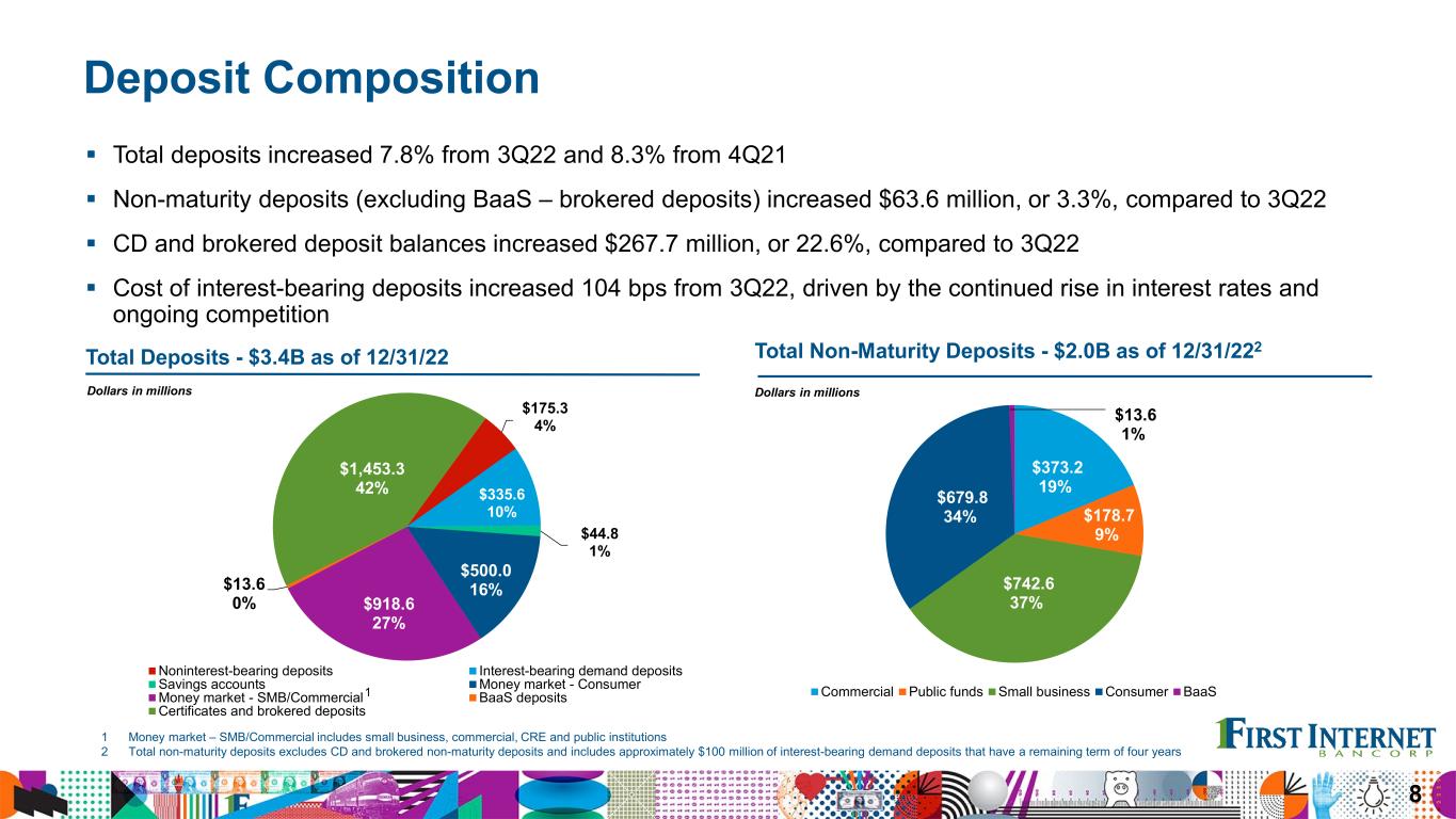 Loan Portfolio Overview  Total loan portfolio balances increased 7.5% from 3Q22 and 21.2% from 4Q21  Commercial loan balances increased $184.3 million, or 7.3%, compared to 3Q22 – Growth in franchise finance, single tenant lease financing, construction, commercial and industrial and small business lending  Consumer loan balances increased $61.1 million, or 9.1%, compared to 3Q22 – Growth in residential mortgage balances, recreational vehicles and trailers  4Q22 funded portfolio loan origination yields were up 84 bps from 3Q22 7 Loan Portfolio Mix1 1 Percentages may not add up to 100% due to rounding 2 Includes commercial and industrial and owner-occupied commercial real estate balances Dollars in millions 2 11% 10% 10% 10% 9% 9% 16% 16% 11% 8% 7% 12%3% 9% 1% 2% 4% 4% 4% 2% 4% 11% 17% 13% 8% 22% 26% 24% 20% 21% 18% 38% 34% 34% 31% 30% 27% 2% 2% 2% 4% 6% 8% 9% 7% 6% 6% 6% 5% $2,091.0 $2,716.2 $2,963.5 $3,059.2 $2,887.7 $3,499.4 2017 2018 2019 2020 2021 2022 Commercial and Industrial Construction and Investor CRE Single Tenant Lease Financing Public Finance Healthcare Finance Small Business Lending Franchise Finance Residential Mortgage/HE/HELOCs Consumer