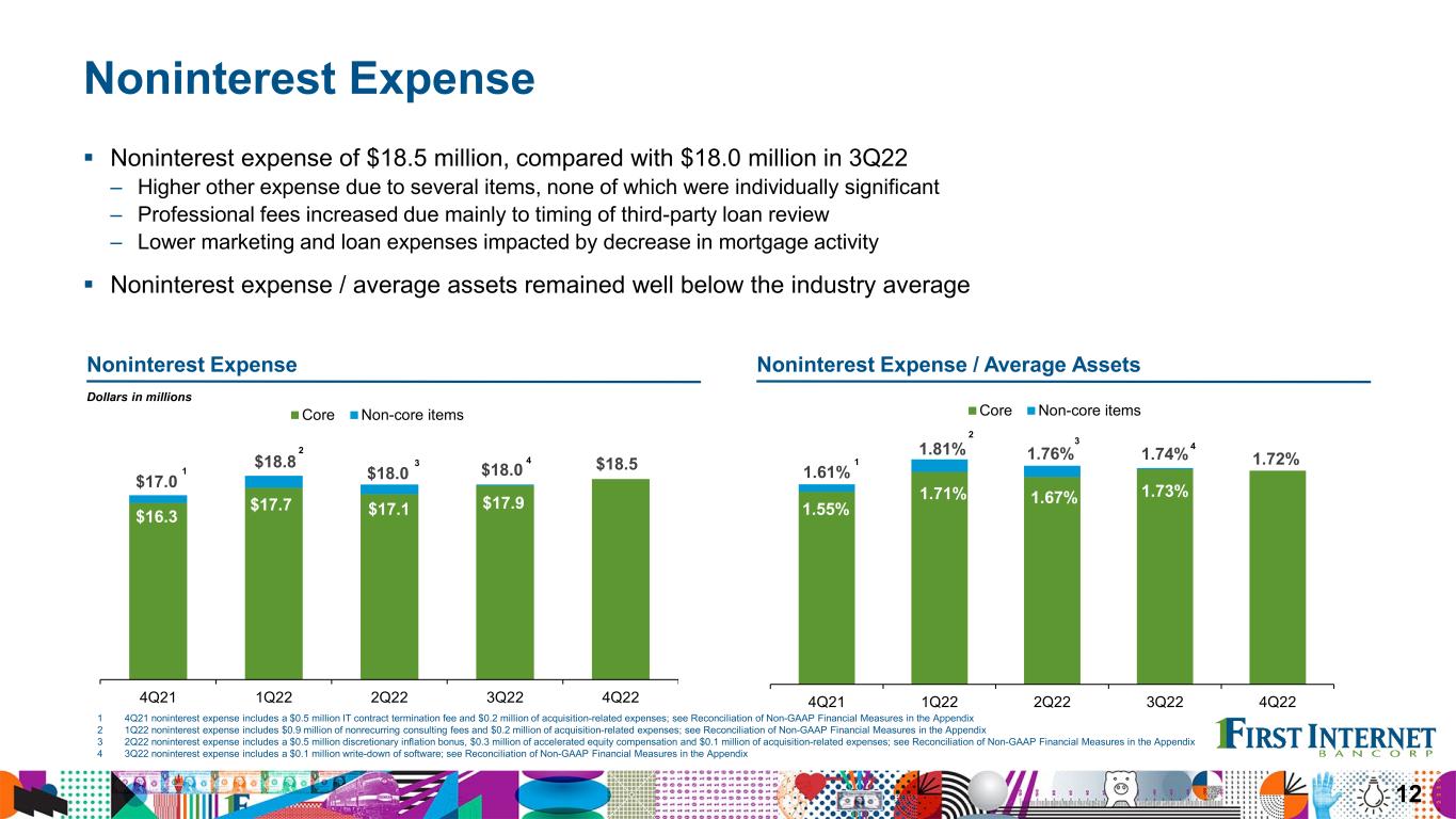 Noninterest Income 11 Dollars in millions Noninterest Income 4Q22 Dollars in millions Noninterest Income  Noninterest income of $5.8 million, compared to $4.3 million in 3Q22 and compared to $7.7 million in 4Q21 – Distributions from fund investments drove the increase in other income  Gain on sale of loans of $2.9 million, compared to $2.7 million in 3Q22 and $4.1 million in 4Q21 – SBA loan sale volume increased 23.1% compared to 3Q22; partially offset by lower net gain on sale premiums  Mortgage banking revenue of $1.0 million, compared to $0.9 million in 3Q22 – Interest rate lock and sold loan volumes continue to be significantly impacted by the rise in interest rates $0.2 $0.2 $2.9 $1.0 $1.5 Service charges and fees Net loan servicing revenue Gain on sale of loans Mortgage banking activities Other $7.7 $6.8 $4.3 $4.3 $5.8 4Q21 1Q22 2Q22 3Q22 4Q22