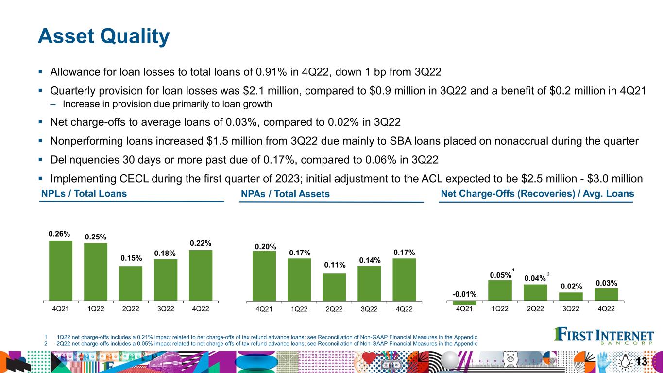 Noninterest Expense  Noninterest expense of $18.5 million, compared with $18.0 million in 3Q22 – Higher other expense due to several items, none of which were individually significant – Professional fees increased due mainly to timing of third-party loan review – Lower marketing and loan expenses impacted by decrease in mortgage activity  Noninterest expense / average assets remained well below the industry average 12 1 4Q21 noninterest expense includes a $0.5 million IT contract termination fee and $0.2 million of acquisition-related expenses; see Reconciliation of Non-GAAP Financial Measures in the Appendix 2 1Q22 noninterest expense includes $0.9 million of nonrecurring consulting fees and $0.2 million of acquisition-related expenses; see Reconciliation of Non-GAAP Financial Measures in the Appendix 3 2Q22 noninterest expense includes a $0.5 million discretionary inflation bonus, $0.3 million of accelerated equity compensation and $0.1 million of acquisition-related expenses; see Reconciliation of Non-GAAP Financial Measures in the Appendix 4 3Q22 noninterest expense includes a $0.1 million write-down of software; see Reconciliation of Non-GAAP Financial Measures in the Appendix Dollars in millions Noninterest Expense Noninterest Expense / Average Assets 1.73%1.71% 1.55% 1.61% 1.81% 1.76% 1.74% 1.72% 4Q21 1Q22 2Q22 3Q22 4Q22 Core Non-core items 3 1 1.67%1.71% 1.55% 2 $17.0 $18.8 $18.0 $18.0 $18.5 4Q21 1Q22 2Q22 3Q22 4Q22 Core Non-core items $16.3 $17.7 $17.1 1 2 3 4 4 1.73%$17.9