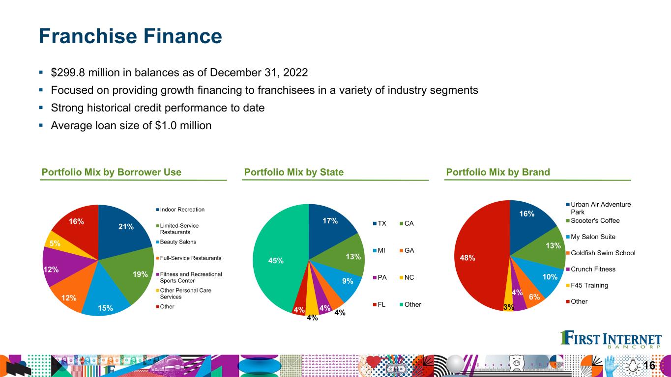 17% 13% 9% 4%4% 4% 4% 45% TX CA MI GA PA NC FL Other Franchise Finance  $299.8 million in balances as of December 31, 2022  Focused on providing growth financing to franchisees in a variety of industry segments  Strong historical credit performance to date  Average loan size of $1.0 million 16 Portfolio Mix by Borrower Use Portfolio Mix by State Portfolio Mix by Brand 21% 19% 15% 12% 12% 5% 16% Indoor Recreation Limited-Service Restaurants Beauty Salons Full-Service Restaurants Fitness and Recreational Sports Center Other Personal Care Services Other 16% 13% 10% 6%4% 3% 48% Urban Air Adventure Park Scooter's Coffee My Salon Suite Goldfish Swim School Crunch Fitness F45 Training Other 131