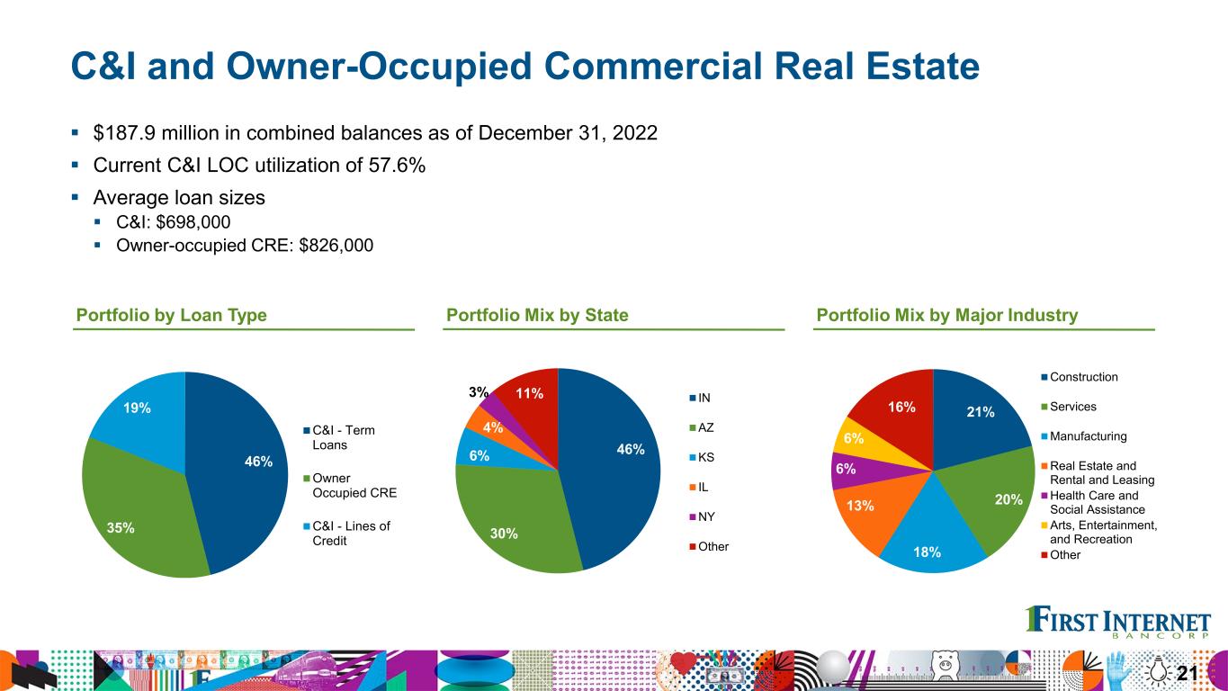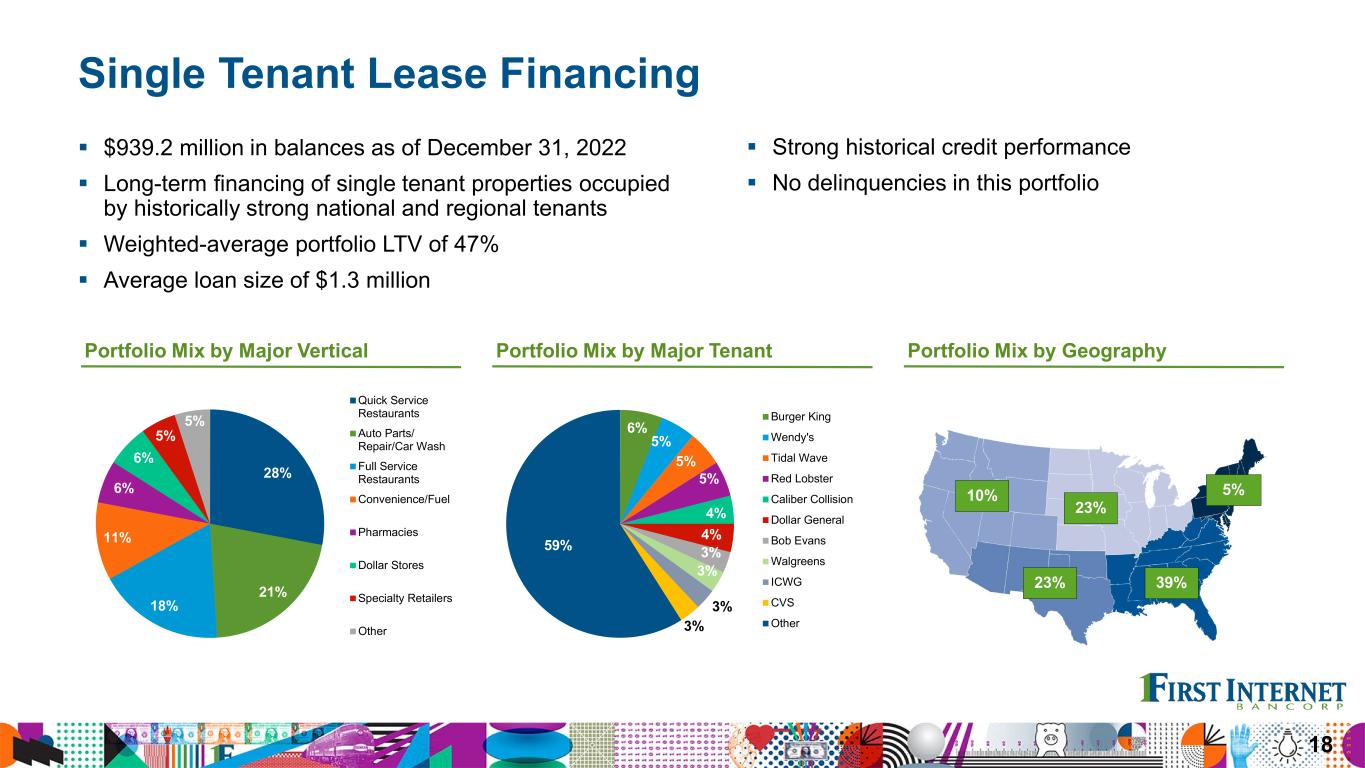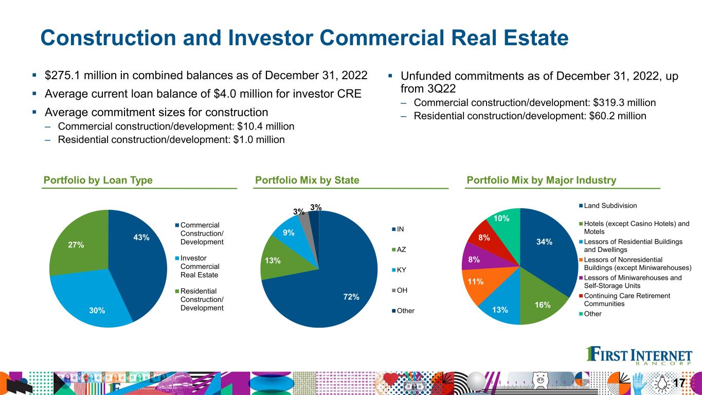 34% 16%13% 11% 8% 8% 10% Land Subdivision Hotels (except Casino Hotels) and Motels Lessors of Residential Buildings and Dwellings Lessors of Nonresidential Buildings (except Miniwarehouses) Lessors of Miniwarehouses and Self-Storage Units Continuing Care Retirement Communities Other 72% 13% 9% 3% 3% IN AZ KY OH Other 43% 30% 27% Commercial Construction/ Development Investor Commercial Real Estate Residential Construction/ Development Construction and Investor Commercial Real Estate  $275.1 million in combined balances as of December 31, 2022  Average current loan balance of $4.0 million for investor CRE  Average commitment sizes for construction – Commercial construction/development: $10.4 million – Residential construction/development: $1.0 million 17 Portfolio by Loan Type Portfolio Mix by State Portfolio Mix by Major Industry  Unfunded commitments as of December 31, 2022, up from 3Q22 – Commercial construction/development: $319.3 million – Residential construction/development: $60.2 million