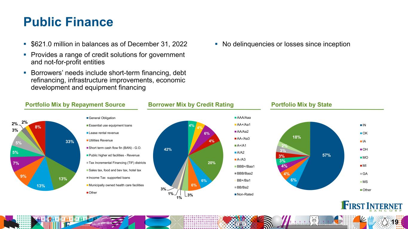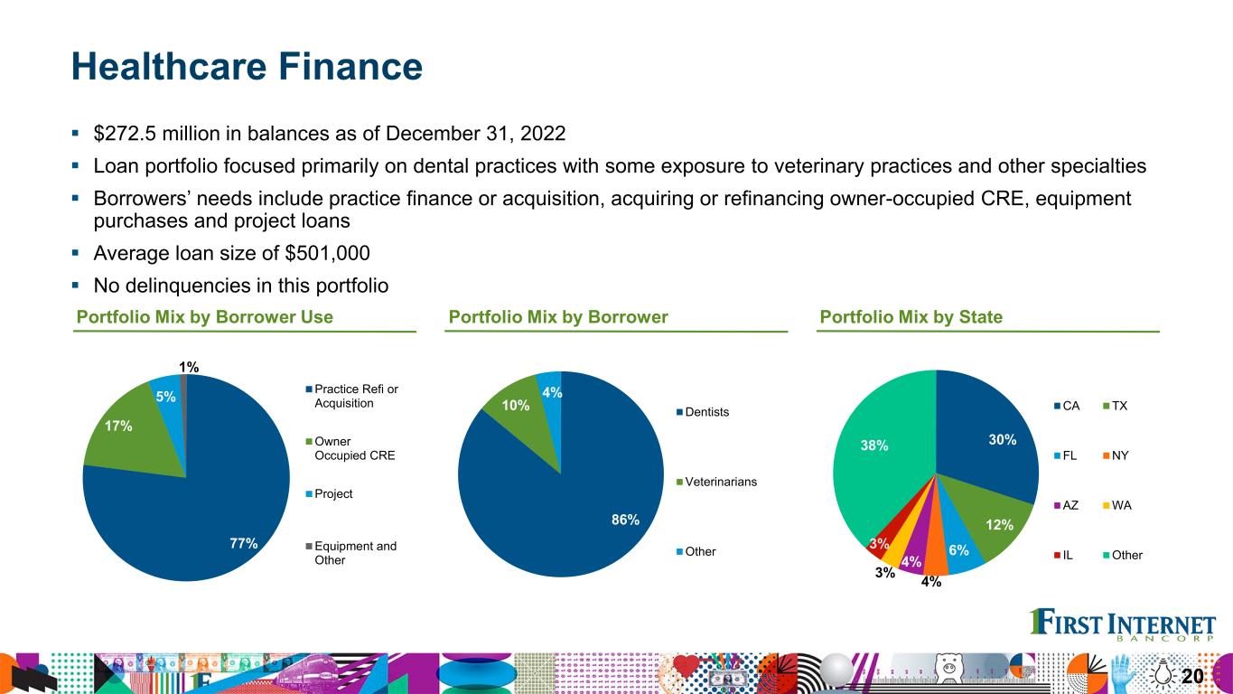 4% 4% 6% 4% 20% 6% 6% 3%1% 1% 3% 42% AAA/Aaa AA+/Aa1 AA/Aa2 AA-/Aa3 A+/A1 A/A2 A-/A3 BBB+/Baa1 BBB/Baa2 BB+/Ba1 BB/Ba2 Non-Rated 33% 13% 13% 9% 7% 5% 5% 3% 2% 2% 8% General Obligation Essential use equipment loans Lease rental revenue Utilities Revenue Short term cash flow fin (BAN) - G.O. Public higher ed facilities - Revenue Tax Incremental Financing (TIF) districts Sales tax, food and bev tax, hotel tax Income Tax supported loans Municipally owned health care facilities Other 57% 6% 4% 4% 3% 3% 3% 2% 18% IN OK IA OH MO MI GA MS Other Public Finance  $621.0 million in balances as of December 31, 2022  Provides a range of credit solutions for government and not-for-profit entities  Borrowers’ needs include short-term financing, debt refinancing, infrastructure improvements, economic development and equipment financing 19  No delinquencies or losses since inception Portfolio Mix by Repayment Source Borrower Mix by Credit Rating Portfolio Mix by State