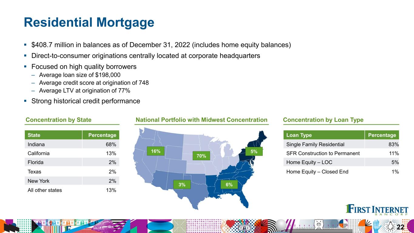 21% 20% 18% 13% 6% 6% 16% Construction Services Manufacturing Real Estate and Rental and Leasing Health Care and Social Assistance Arts, Entertainment, and Recreation Other 46% 30% 6% 4% 3% 11% IN AZ KS IL NY Other 46% 35% 19% C&I - Term Loans Owner Occupied CRE C&I - Lines of Credit C&I and Owner-Occupied Commercial Real Estate  $187.9 million in combined balances as of December 31, 2022  Current C&I LOC utilization of 57.6%  Average loan sizes  C&I: $698,000  Owner-occupied CRE: $826,000 21 Portfolio by Loan Type Portfolio Mix by State Portfolio Mix by Major Industry 21