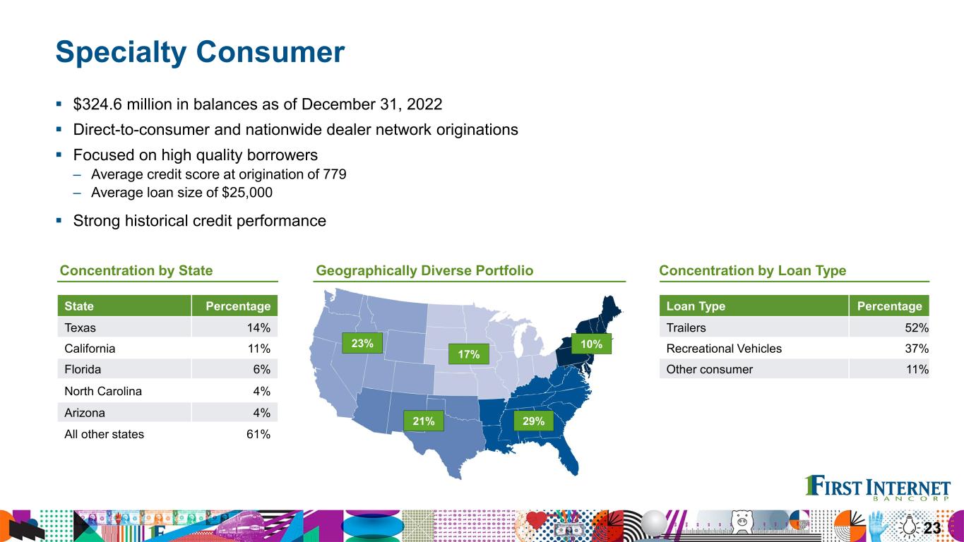 Residential Mortgage  $408.7 million in balances as of December 31, 2022 (includes home equity balances)  Direct-to-consumer originations centrally located at corporate headquarters  Focused on high quality borrowers – Average loan size of $198,000 – Average credit score at origination of 748 – Average LTV at origination of 77%  Strong historical credit performance 22 Concentration by State Concentration by Loan Type State Percentage Indiana 68% California 13% Florida 2% Texas 2% New York 2% All other states 13% National Portfolio with Midwest Concentration 16% 3% 70% 6% 5% Loan Type Percentage Single Family Residential 83% SFR Construction to Permanent 11% Home Equity – LOC 5% Home Equity – Closed End 1% 22