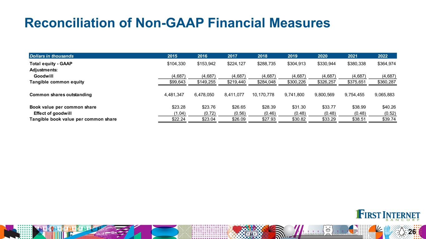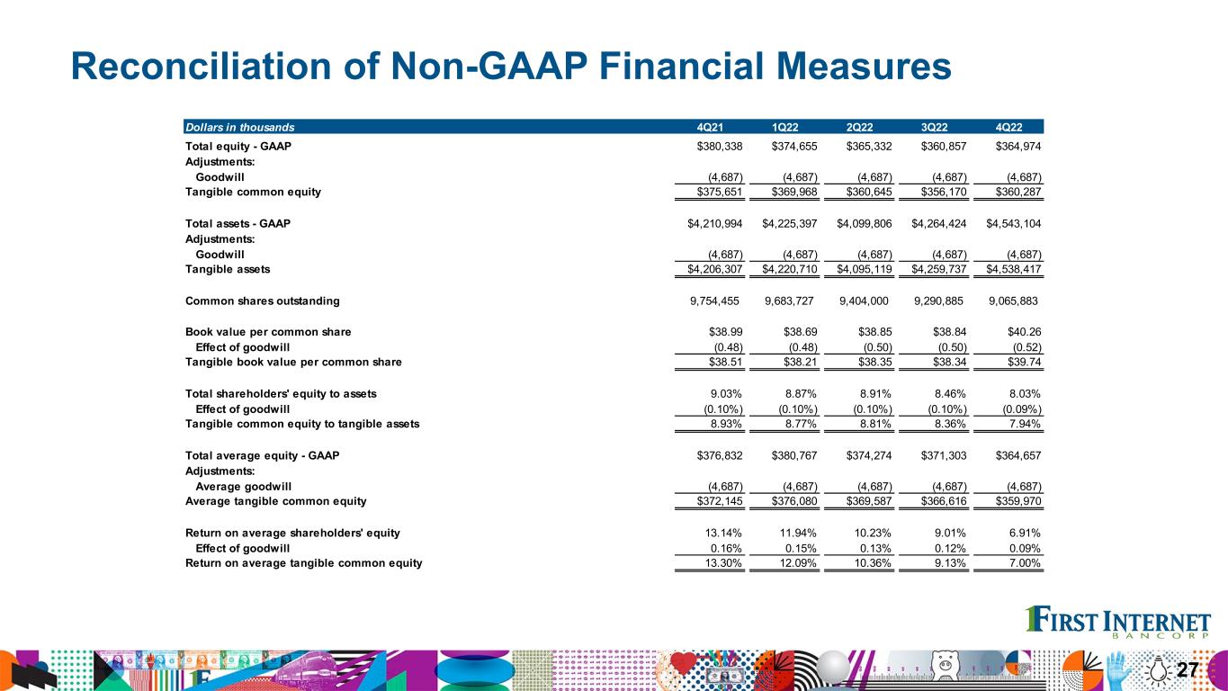 Reconciliation of Non-GAAP Financial Measures 26 Dollars in thousands 2015 2016 2017 2018 2019 2020 2021 2022 Total equity - GAAP $104,330 $153,942 $224,127 $288,735 $304,913 $330,944 $380,338 $364,974 Adjustments: Goodwill (4,687) (4,687) (4,687) (4,687) (4,687) (4,687) (4,687) (4,687) Tangible common equity $99,643 $149,255 $219,440 $284,048 $300,226 $326,257 $375,651 $360,287 Common shares outstanding 4,481,347 6,478,050 8,411,077 10,170,778 9,741,800 9,800,569 9,754,455 9,065,883 Book value per common share $23.28 $23.76 $26.65 $28.39 $31.30 $33.77 $38.99 $40.26 Effect of goodwill (1.04) (0.72) (0.56) (0.46) (0.48) (0.48) (0.48) (0.52) Tangible book value per common share $22.24 $23.04 $26.09 $27.93 $30.82 $33.29 $38.51 $39.74