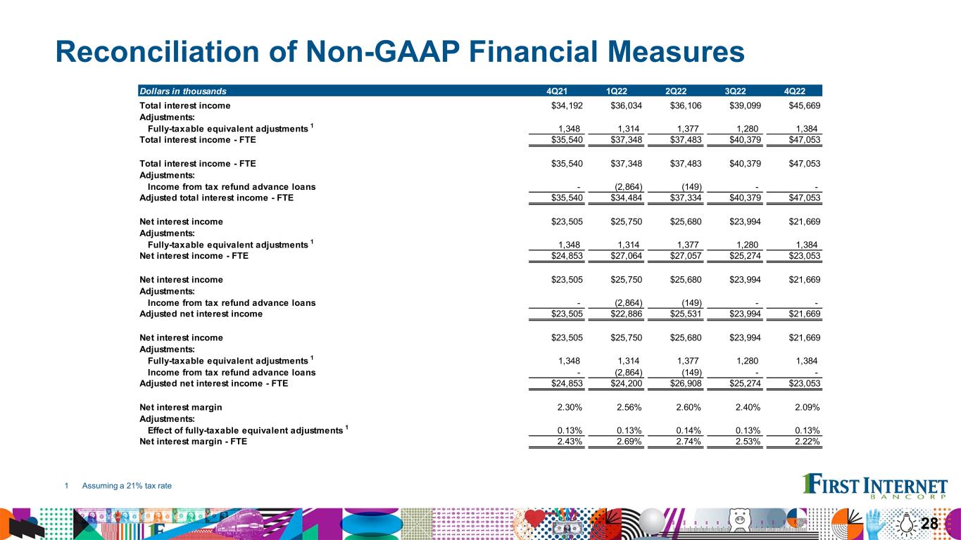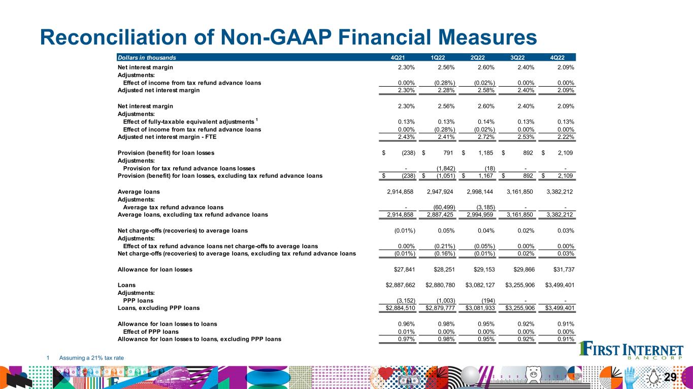 Reconciliation of Non-GAAP Financial Measures 28 1 Assuming a 21% tax rate Dollars in thousands 4Q21 1Q22 2Q22 3Q22 4Q22 Total interest income $34,192 $36,034 $36,106 $39,099 $45,669 Adjustments: Fully-taxable equivalent adjustments 1 1,348 1,314 1,377 1,280 1,384 Total interest income - FTE $35,540 $37,348 $37,483 $40,379 $47,053 Total interest income - FTE $35,540 $37,348 $37,483 $40,379 $47,053 Adjustments: Income from tax refund advance loans - (2,864) (149) - - Adjusted total interest income - FTE $35,540 $34,484 $37,334 $40,379 $47,053 Net interest income $23,505 $25,750 $25,680 $23,994 $21,669 Adjustments: Fully-taxable equivalent adjustments 1 1,348 1,314 1,377 1,280 1,384 Net interest income - FTE $24,853 $27,064 $27,057 $25,274 $23,053 Net interest income $23,505 $25,750 $25,680 $23,994 $21,669 Adjustments: Income from tax refund advance loans - (2,864) (149) - - Adjusted net interest income $23,505 $22,886 $25,531 $23,994 $21,669 Net interest income $23,505 $25,750 $25,680 $23,994 $21,669 Adjustments: Fully-taxable equivalent adjustments 1 1,348 1,314 1,377 1,280 1,384 Income from tax refund advance loans - (2,864) (149) - - Adjusted net interest income - FTE $24,853 $24,200 $26,908 $25,274 $23,053 Net interest margin 2.30% 2.56% 2.60% 2.40% 2.09% Adjustments: Effect of fully-taxable equivalent adjustments 1 0.13% 0.13% 0.14% 0.13% 0.13% Net interest margin - FTE 2.43% 2.69% 2.74% 2.53% 2.22%